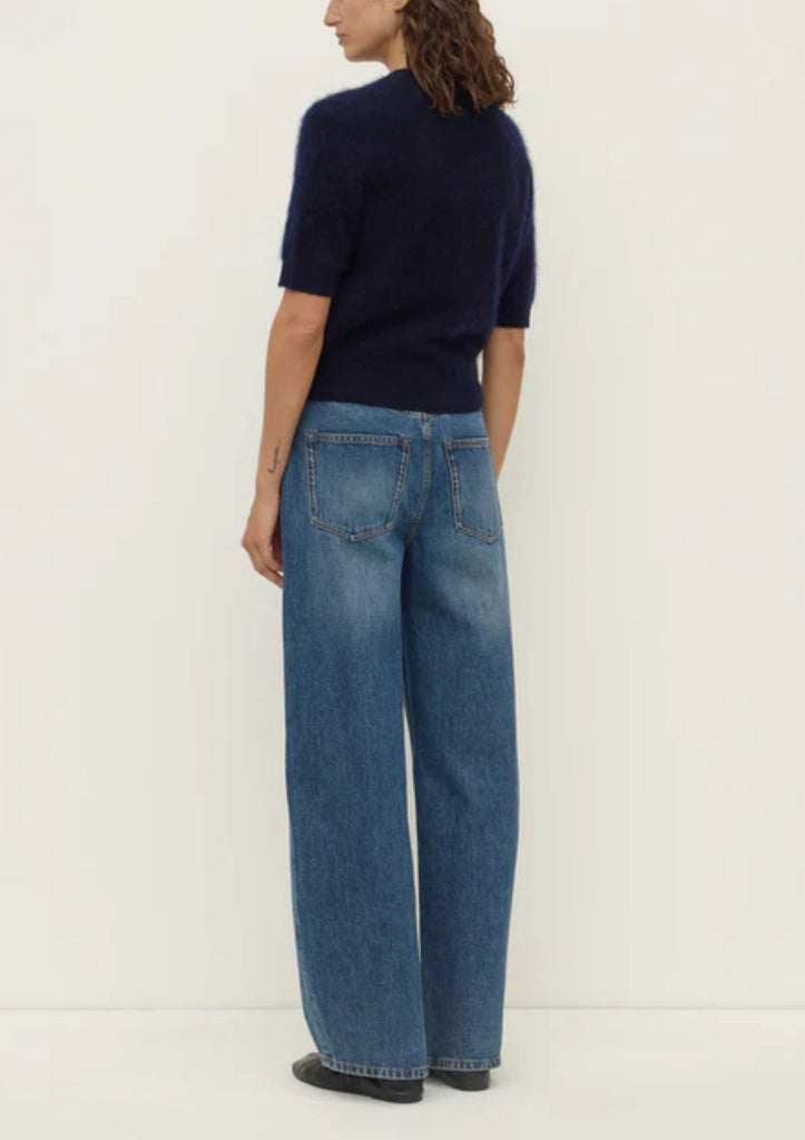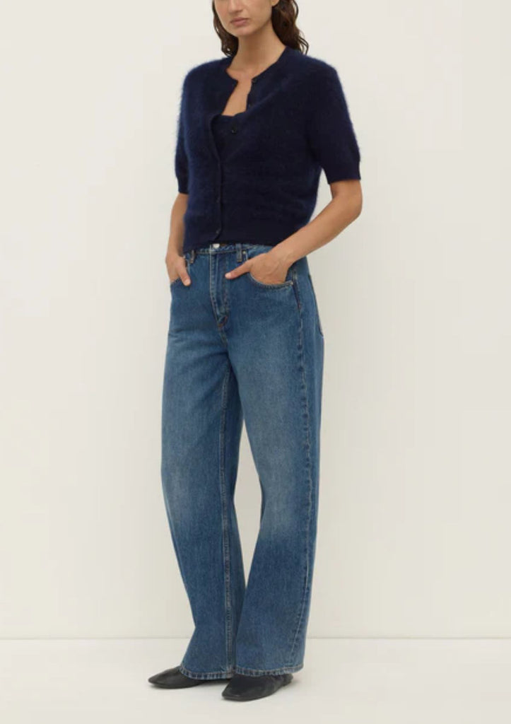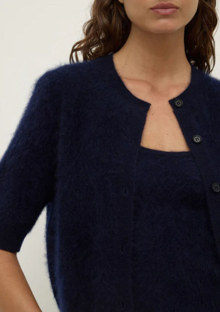 The Carina Wool Short Sleeve Cardigan in navy is a 100% wool cardigan with a crew neck and slightly cropped length.