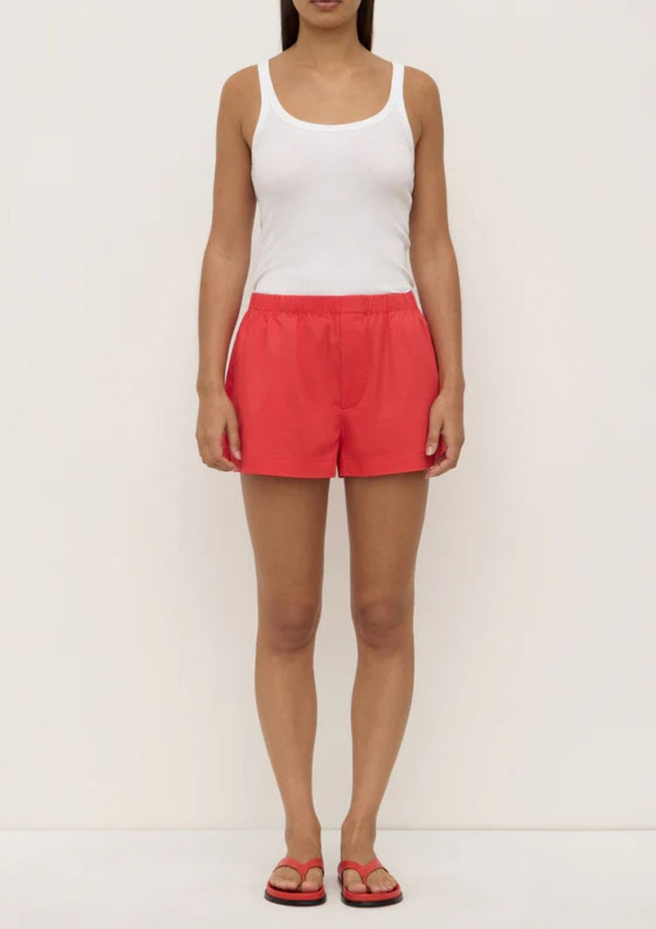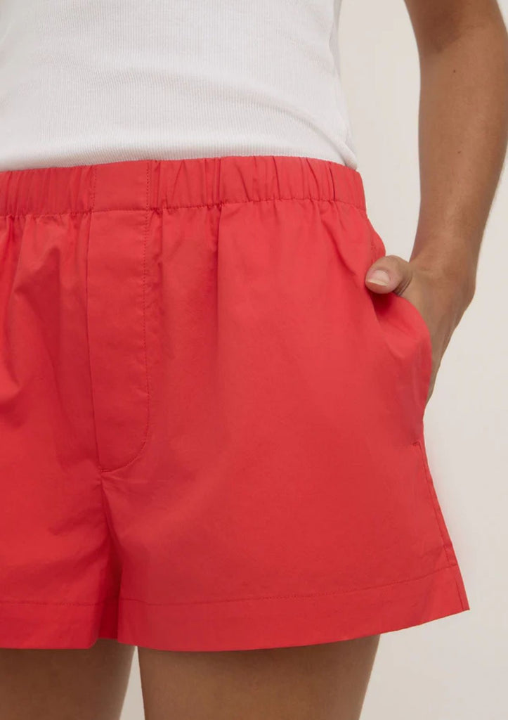 The Everyday Poplin Short in chilli is crafted from 100% cotton with an elasticated waistband, internal waist tie, and relaxed fit.