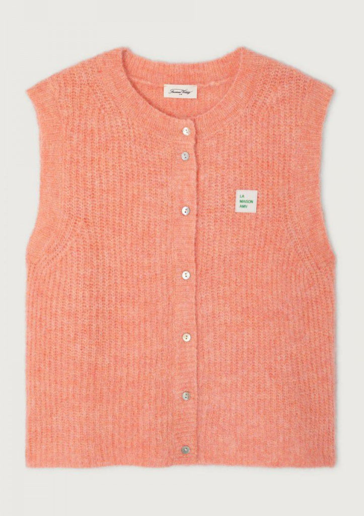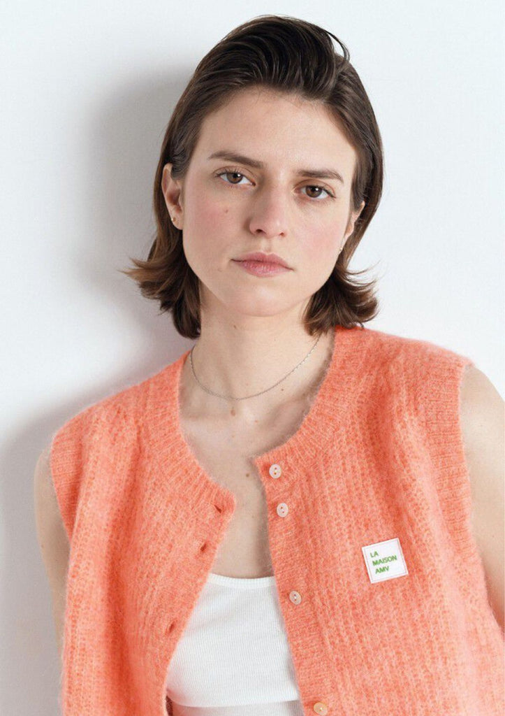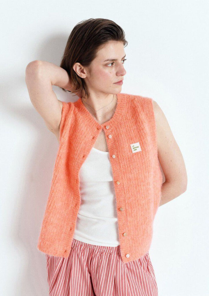 The East sleeveless cardigan is an iconic knit to be worn without moderation. Made from a blend of Italian yarns, it guarantees premium quality and durability. Its timeless, fluffy look makes it an essential that's easy to layer over a long-sleeved t-shirt or wear on its own as a knitted vest top.