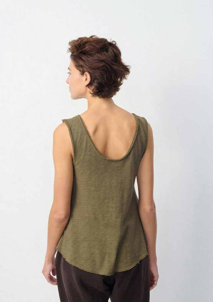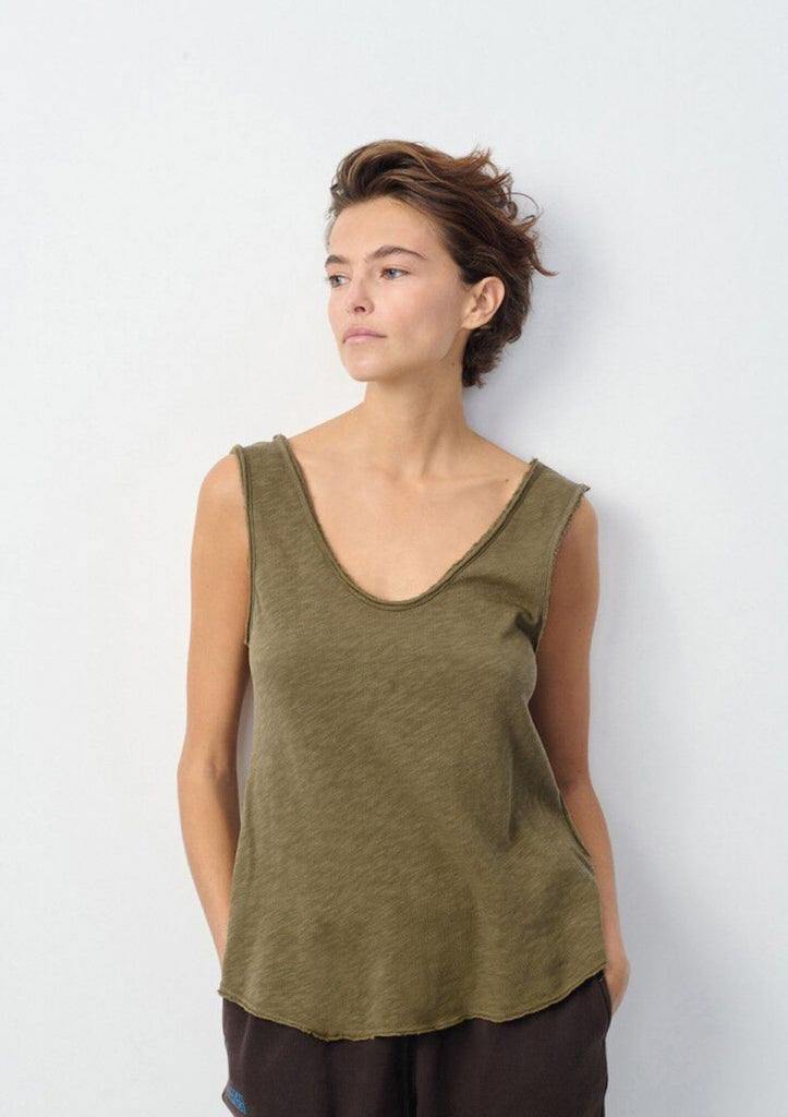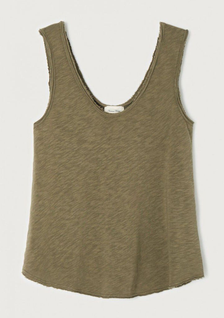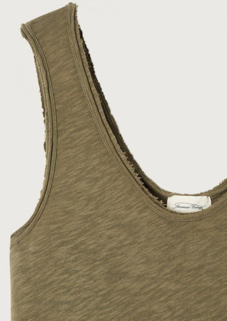 The Sonoma Tank by American Vintage features a relaxed fitting sleeveless design with raw edges. It is crafted from 100% Cotton and has a soft fleck finish in the fabrication.