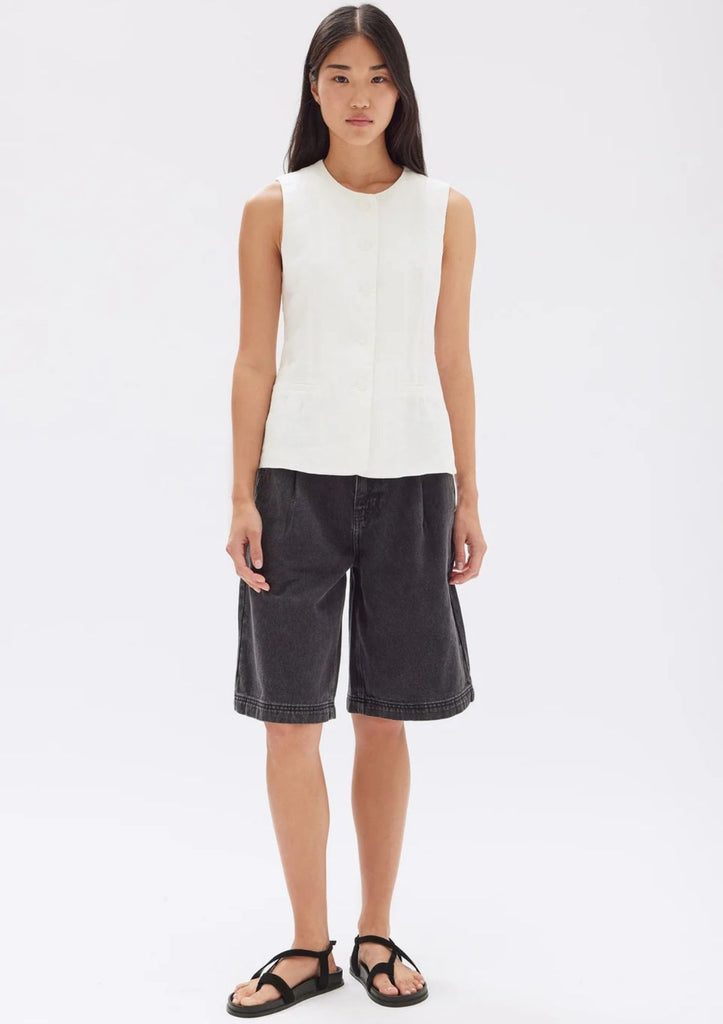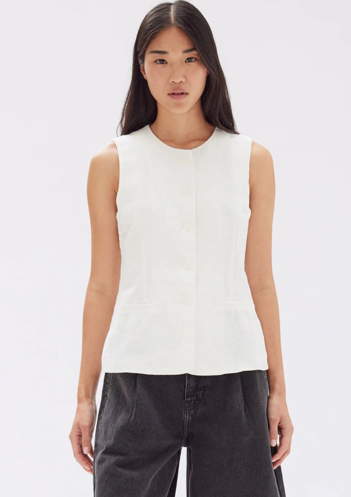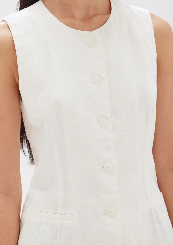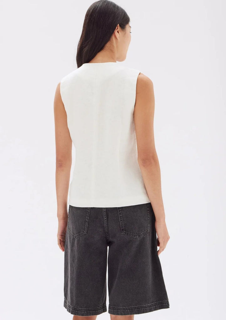 Sleeveless vest style top, seamlessly styled from day to night. Finished with 5-hole white tort button closure.