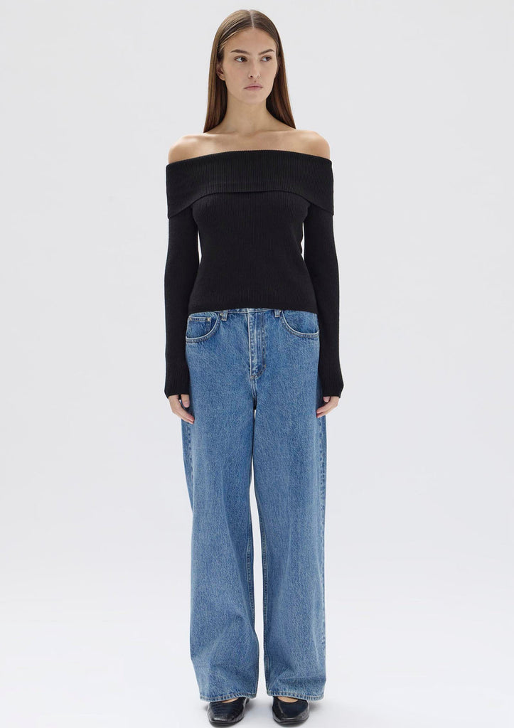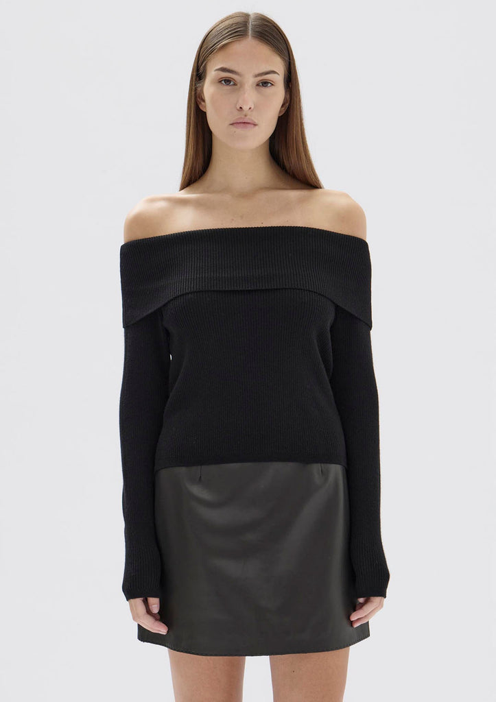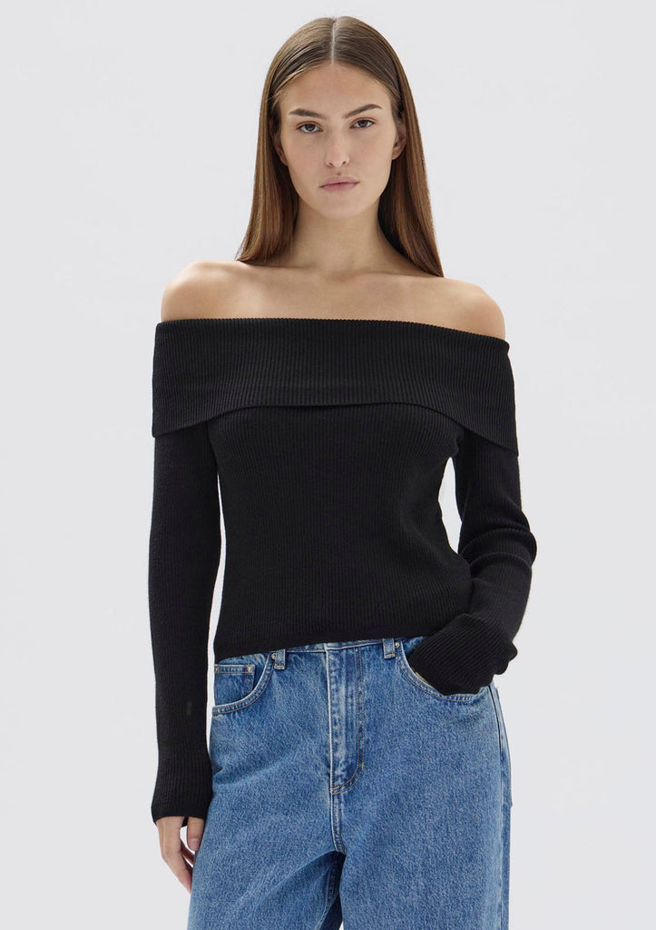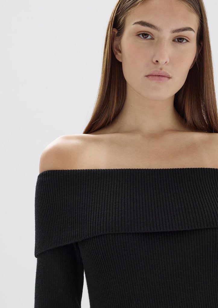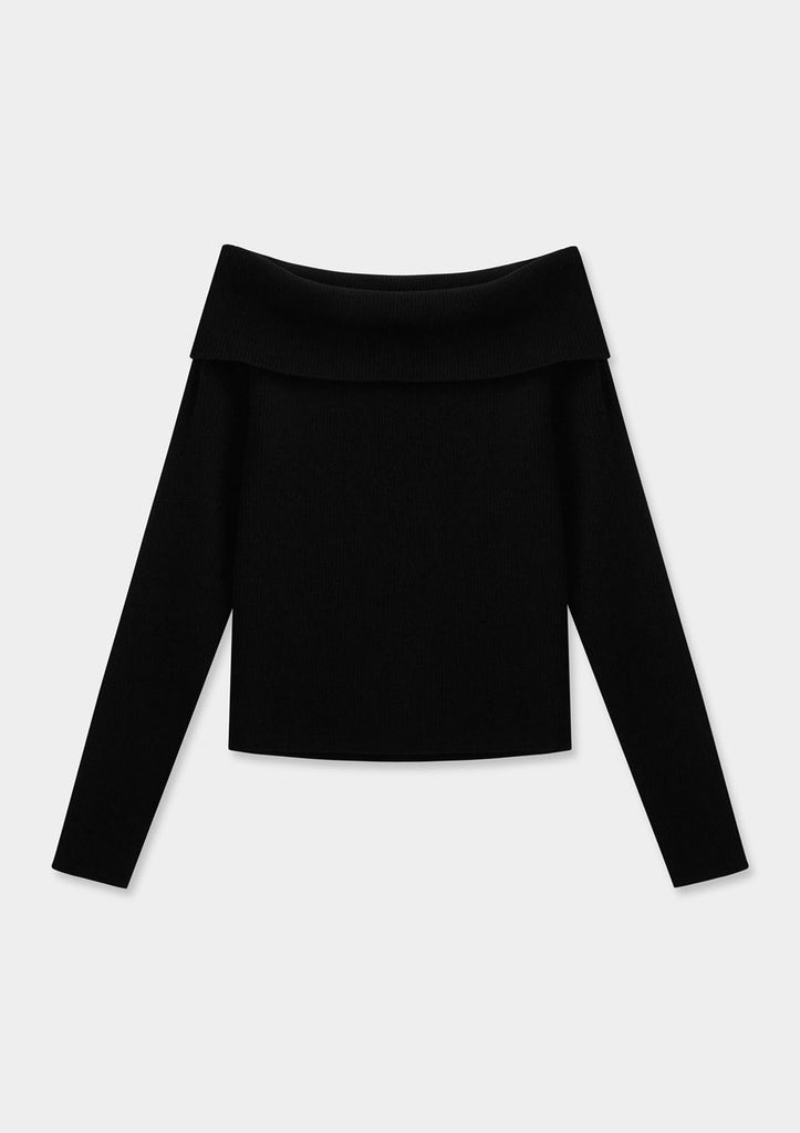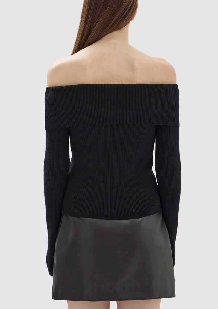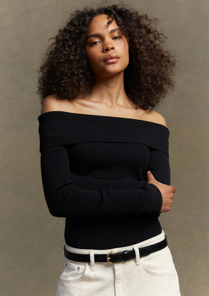 Ribbed knit long sleeve off the shoulder top. Fitted silhouette, crafted with 100% merino wool.
