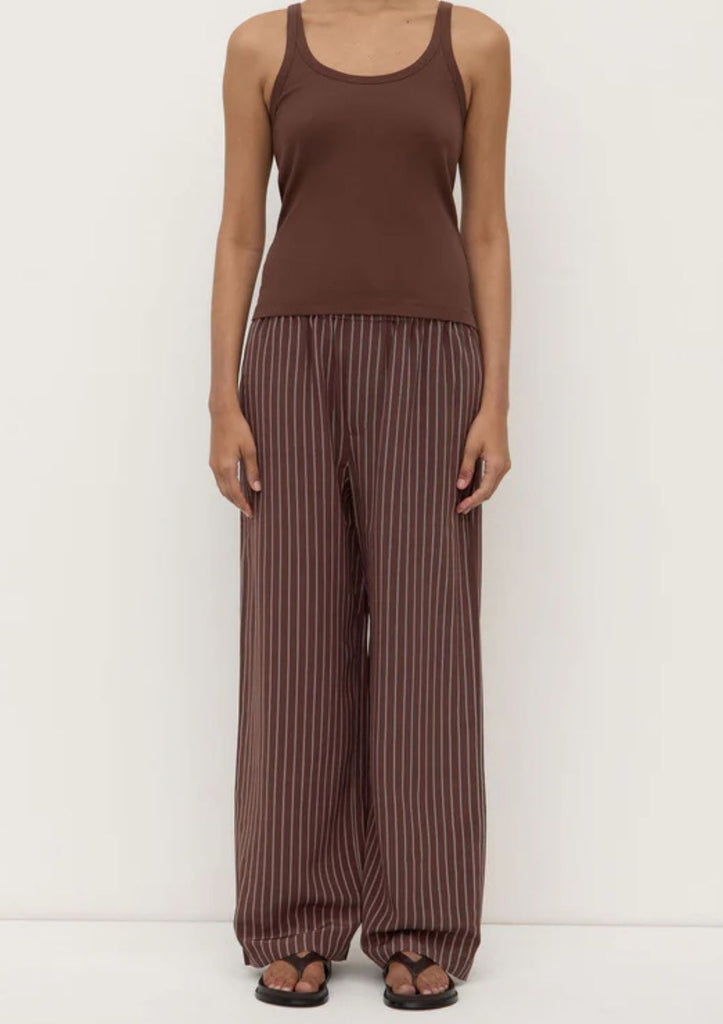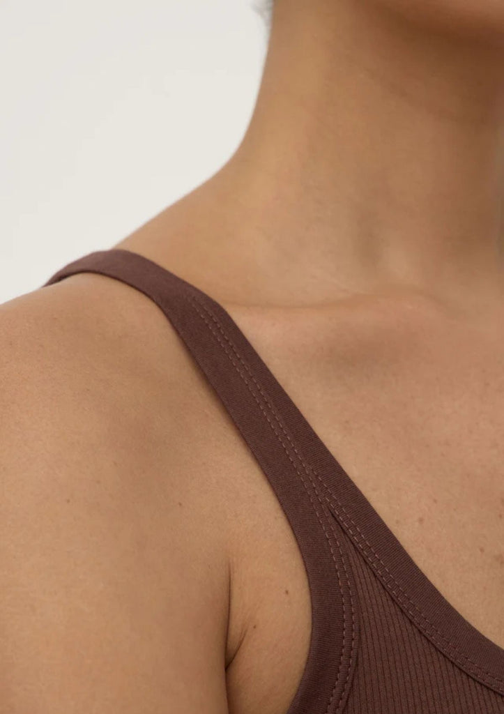 The Charlie Rib Tank in espresso is a soft cotton jersey top with a scoop neckline and ribbed stretch finish.