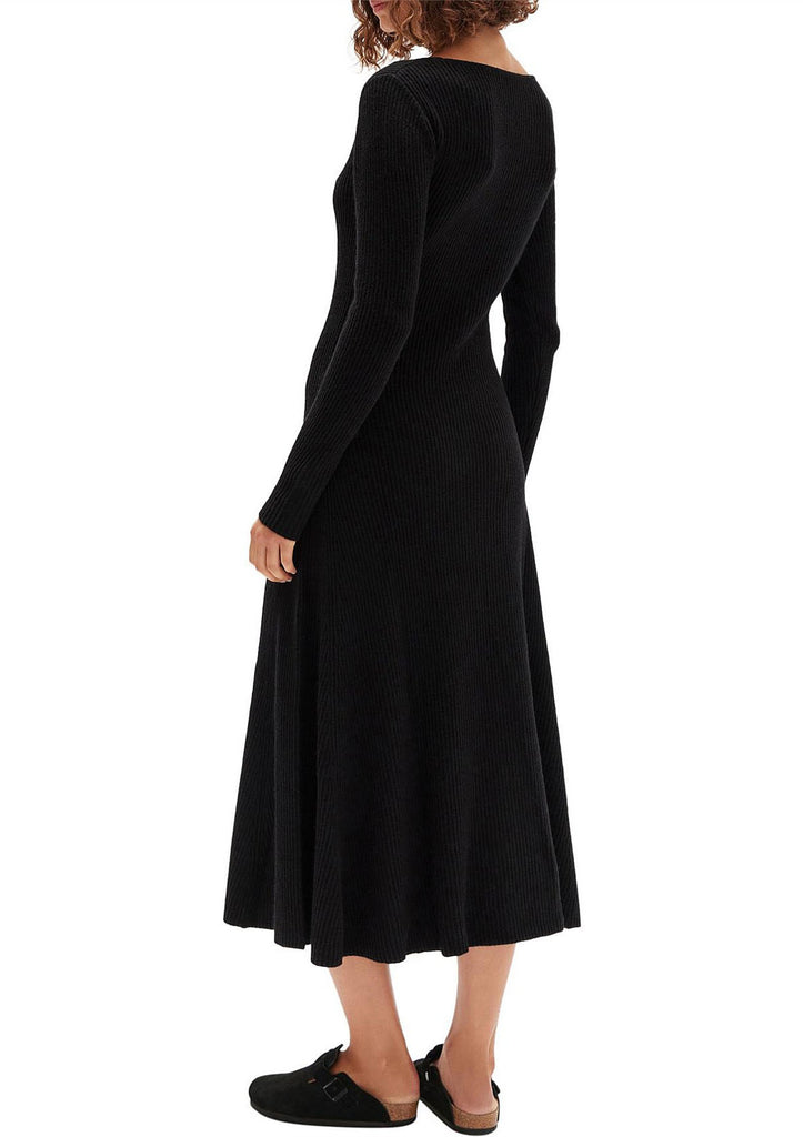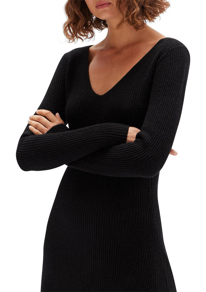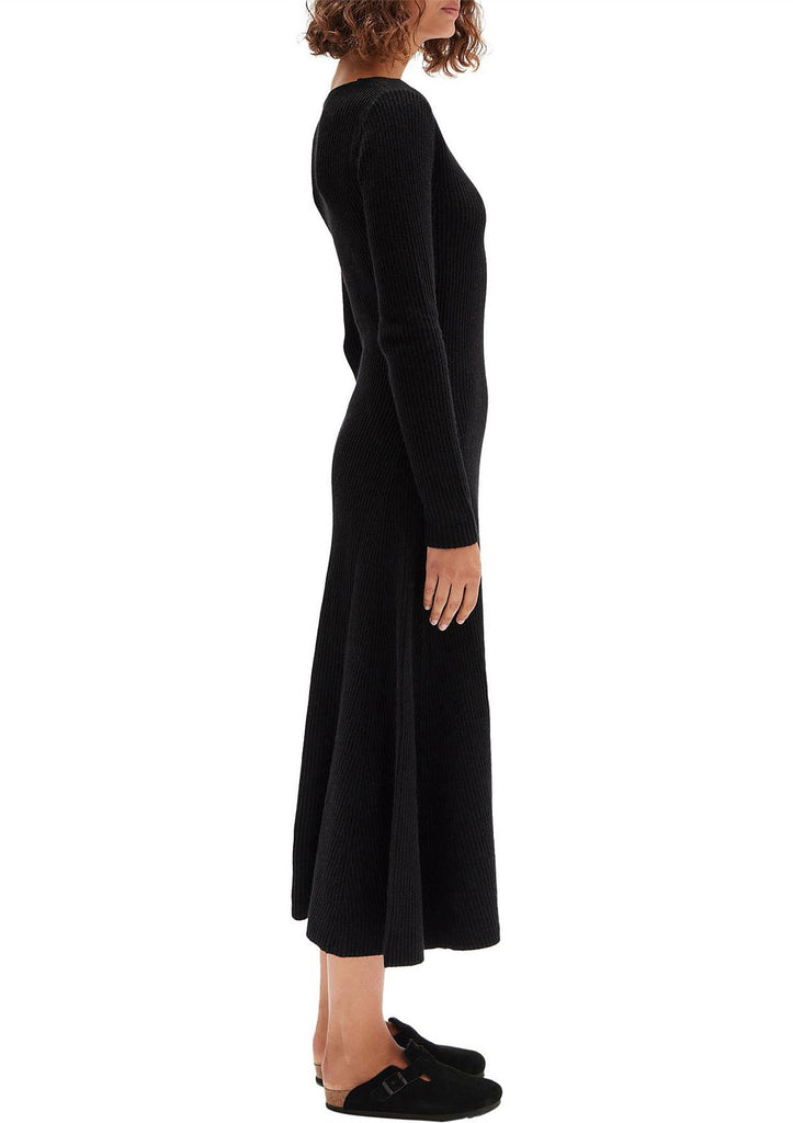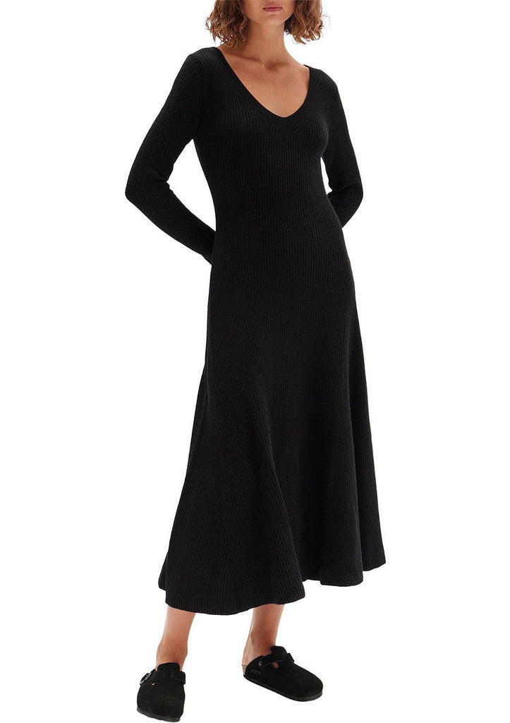 The Gloria Knit Dress features a stretchy ribbed knit material, a V neckline, a midi dress length, a flared draped skirt, and long sleeves. This dress has a slim fit through the torso for a flattering silhouette.