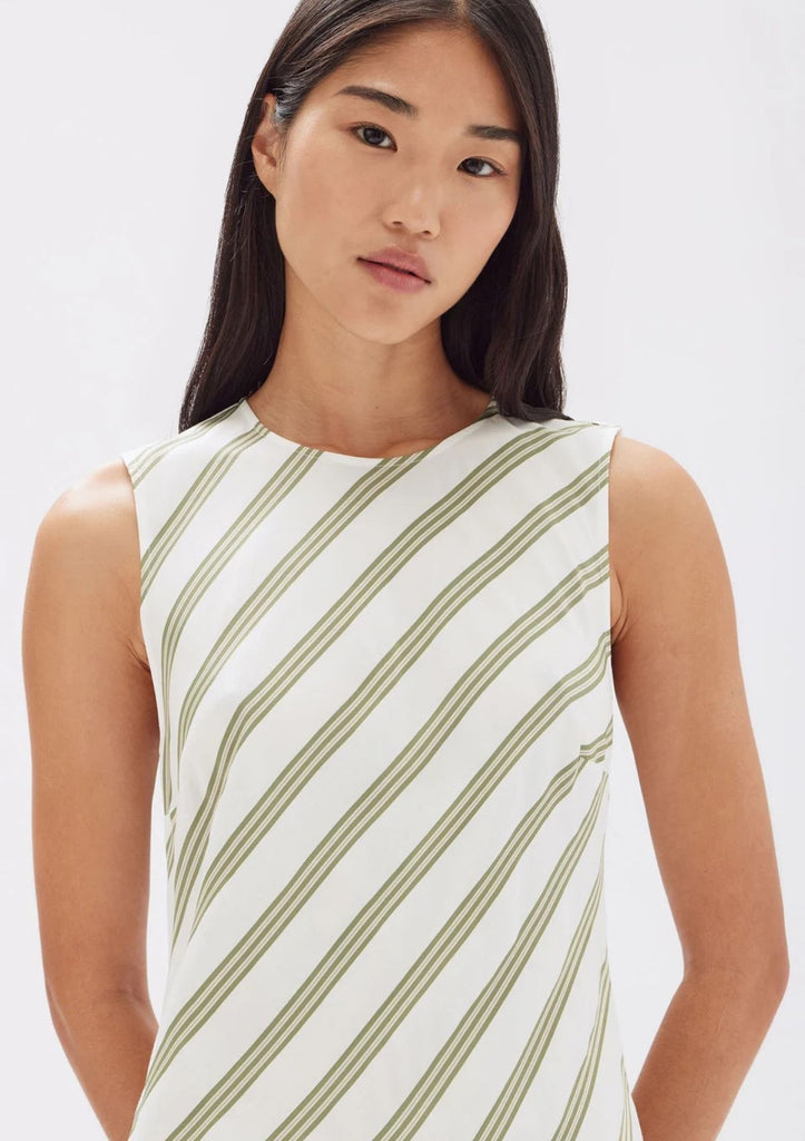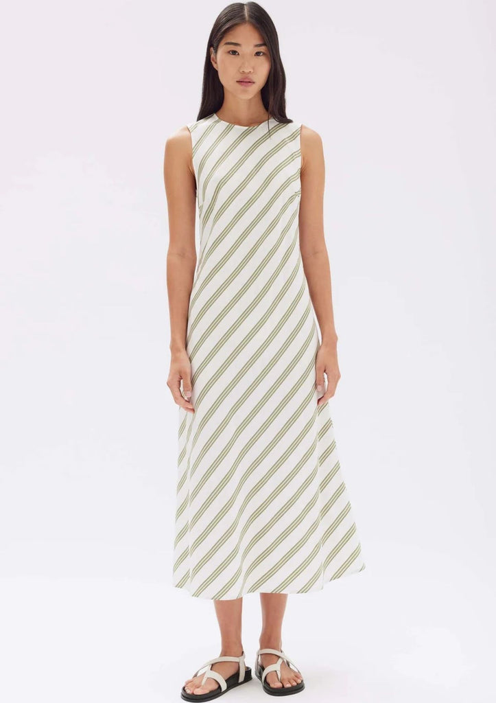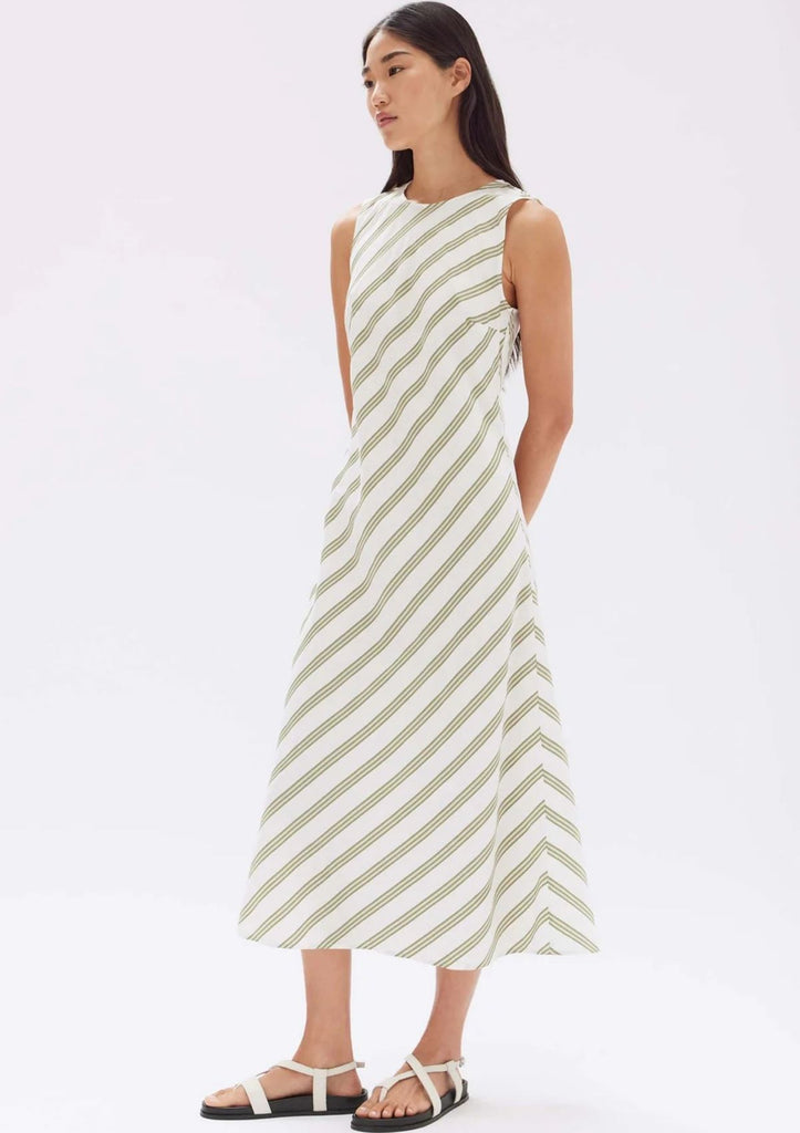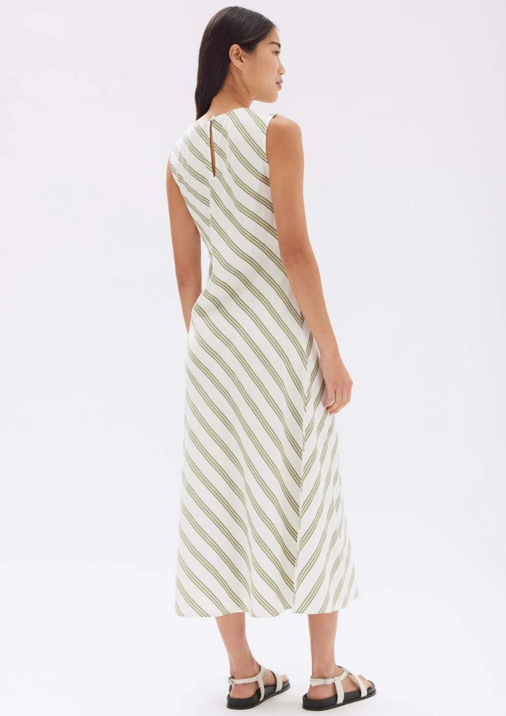 Bias cut sleeveless A-line midi dress. Crafted in premium fabrication sourced from Europe.