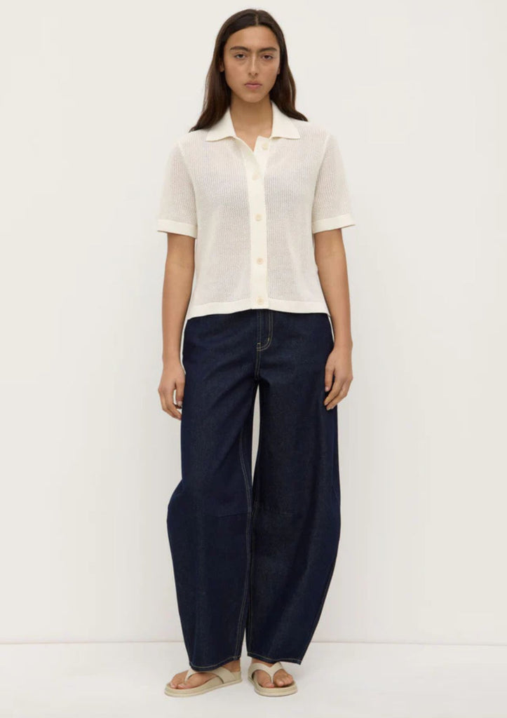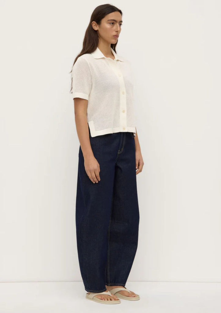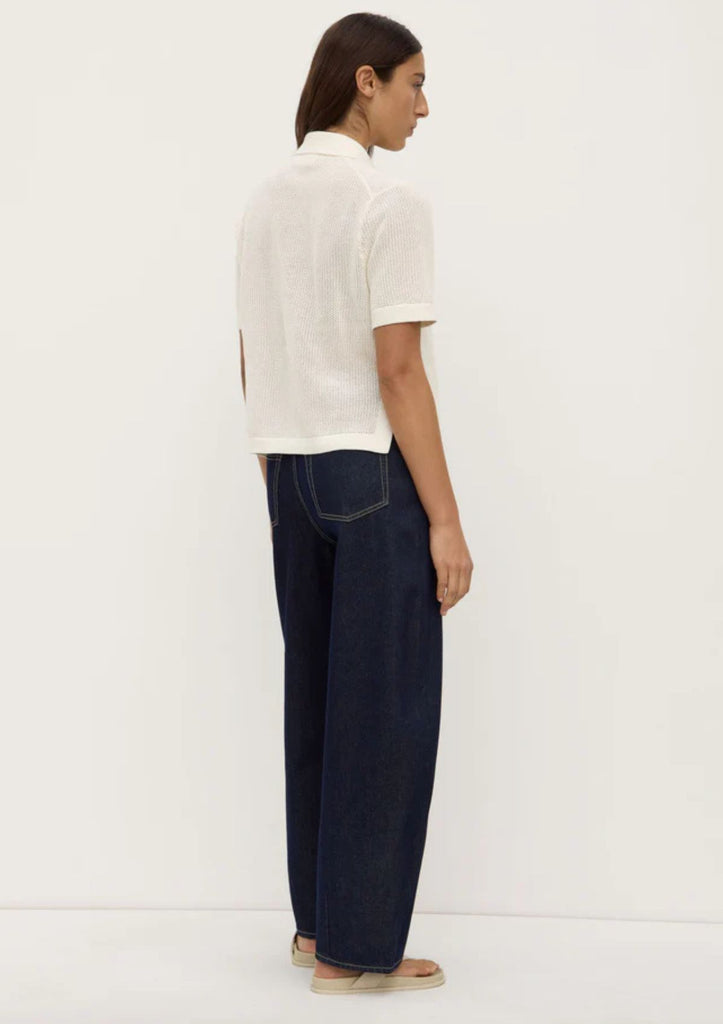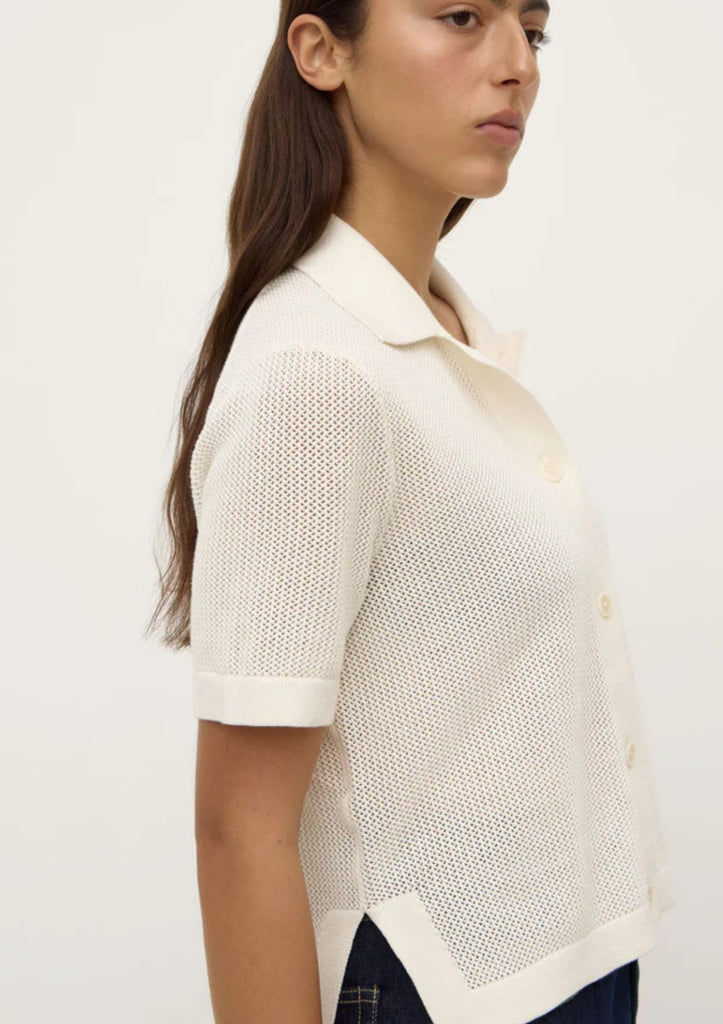 Short sleeved collared knit shirt, crafted from a specialty cotton fabrication. Features side split detailing, ribbed cuffs and a ribbed hem.