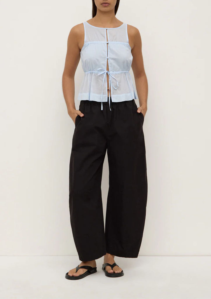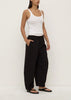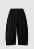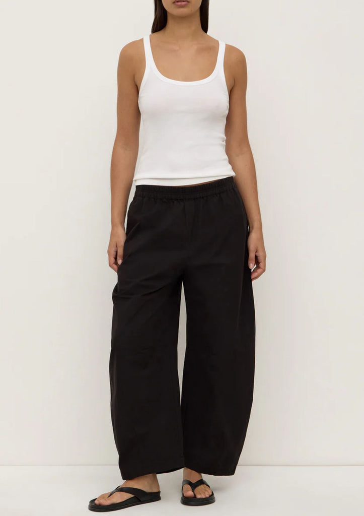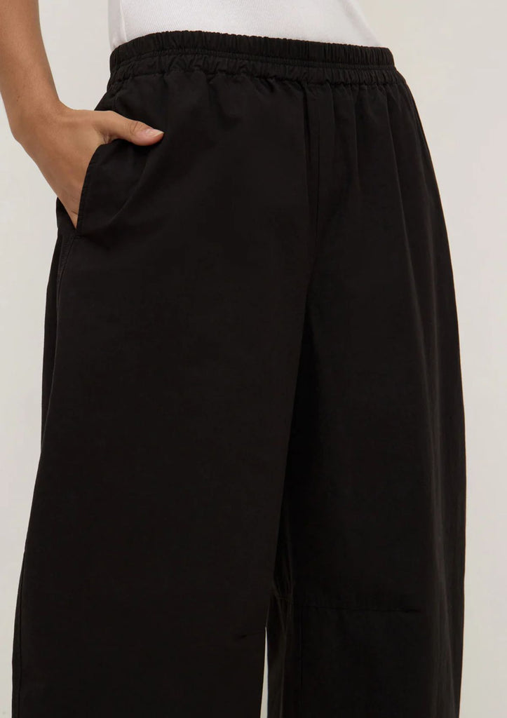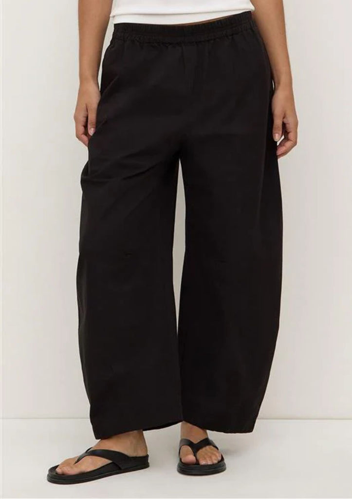The Lola Barrel Leg Pant in black is a 100% cotton voluminous leg pant that flares at the knee and tapers at the ankle.