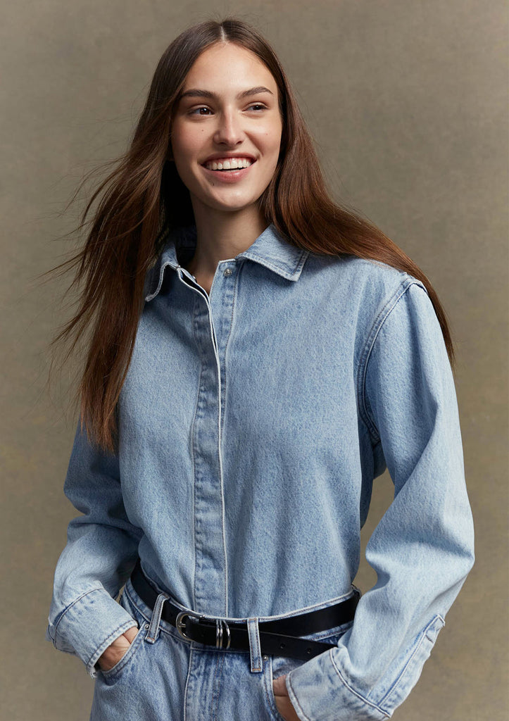 A signature style this season, the Rylee Denim Overshirt is designed be worn like a jacket while retaining the design features of a shirt. Made from premium cotton denim, the overshirt features a collar, curved hem, box pleat, and placket opening with snap hardware through the front. Designed for an oversized fit, layer open over a tee or coordinate with our denim jeans.