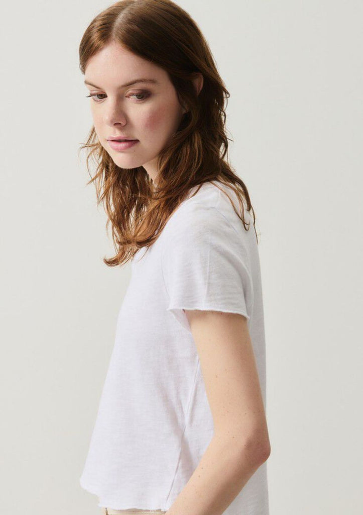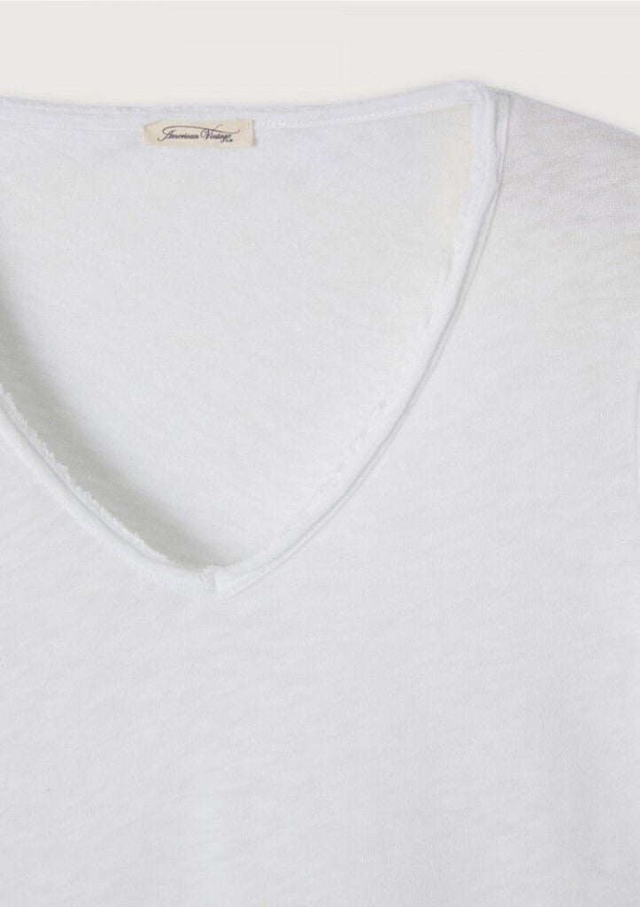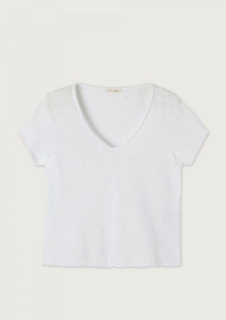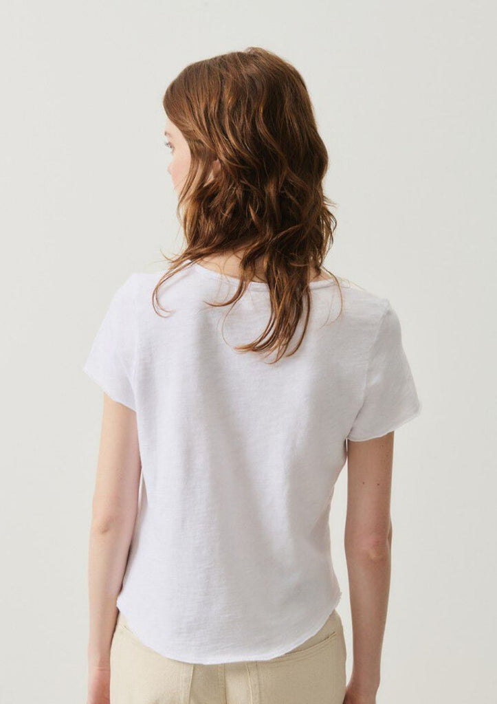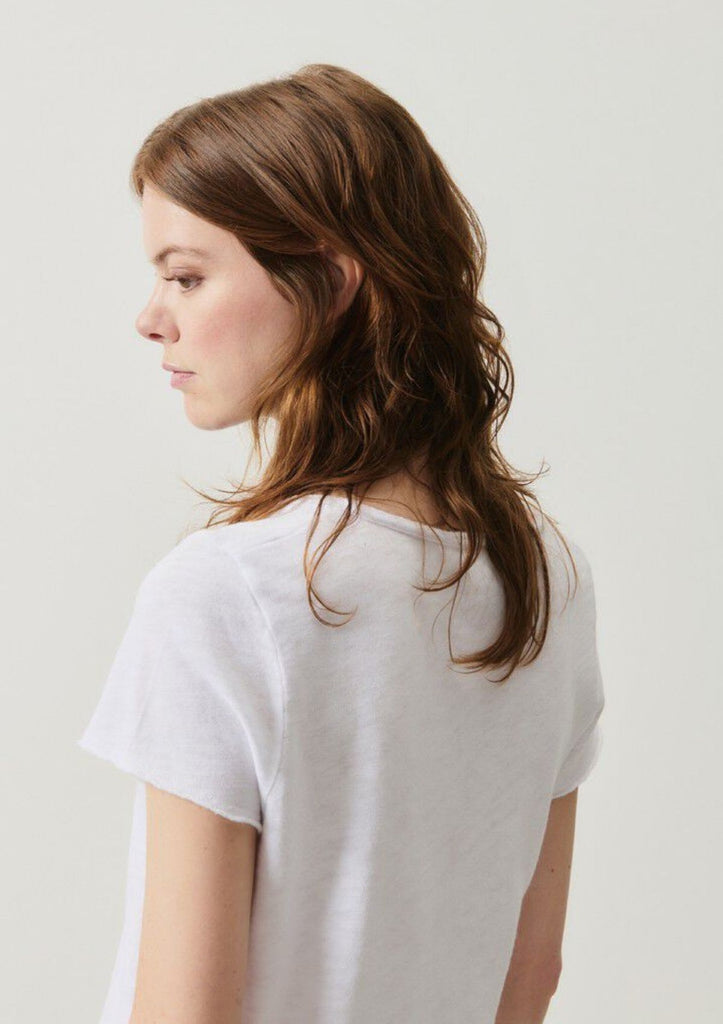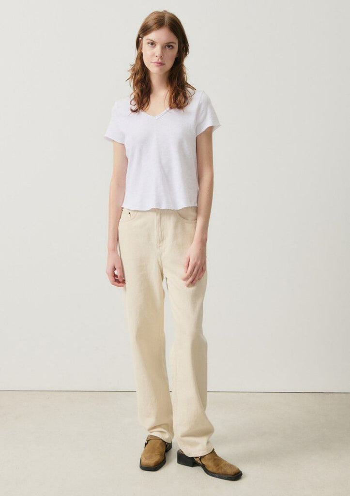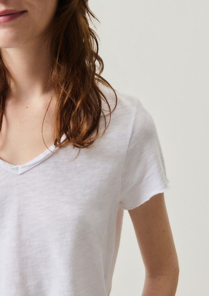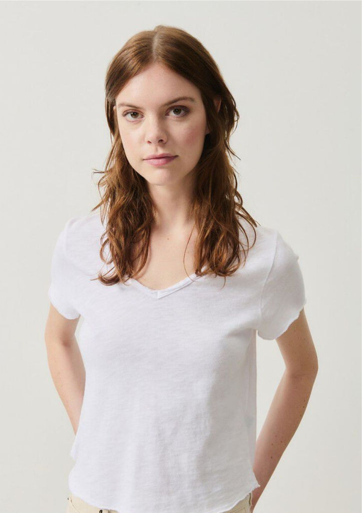 The Sonoma T-Shirt by American Vintage features a V neckline, short sleeves and slightly cropped rolled hemline. It is crafted from 100% Cotton and has a soft fleck finish in the fabrication.