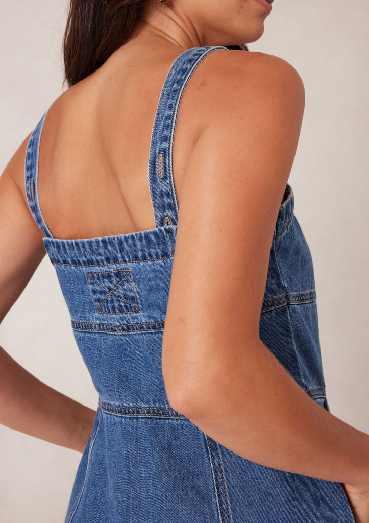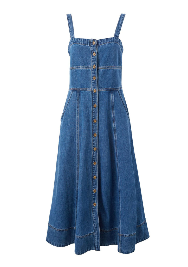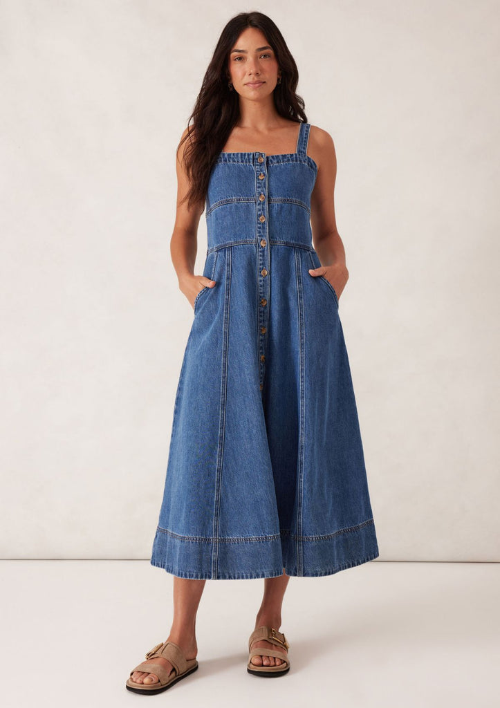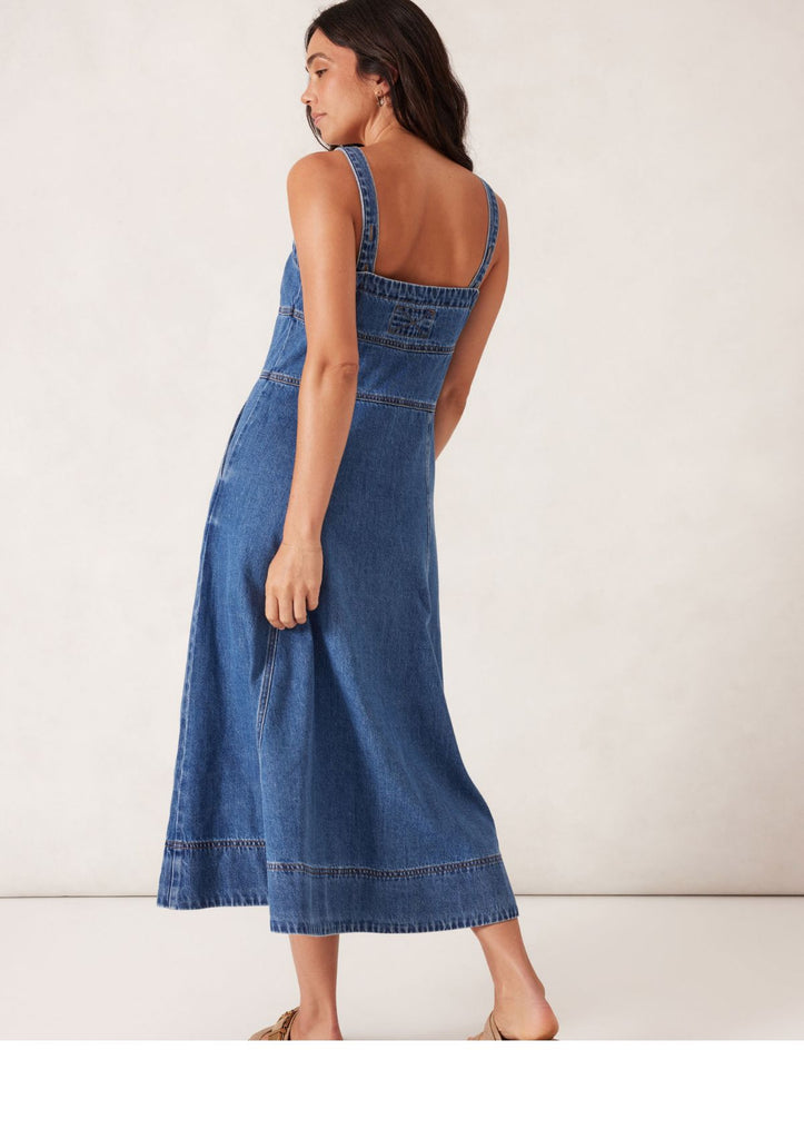 Introducing the Strappy Seamed Midi Dress, crafted from mid-weight denim using 100% organic cotton for a soft touch. Featuring adjustable straps, a full panelled skirt with a deep hem, a functional button front, and handy pockets at the waistband. Perfect for a laid back beach days, wineries or brunches, this dress is the perfect staple.