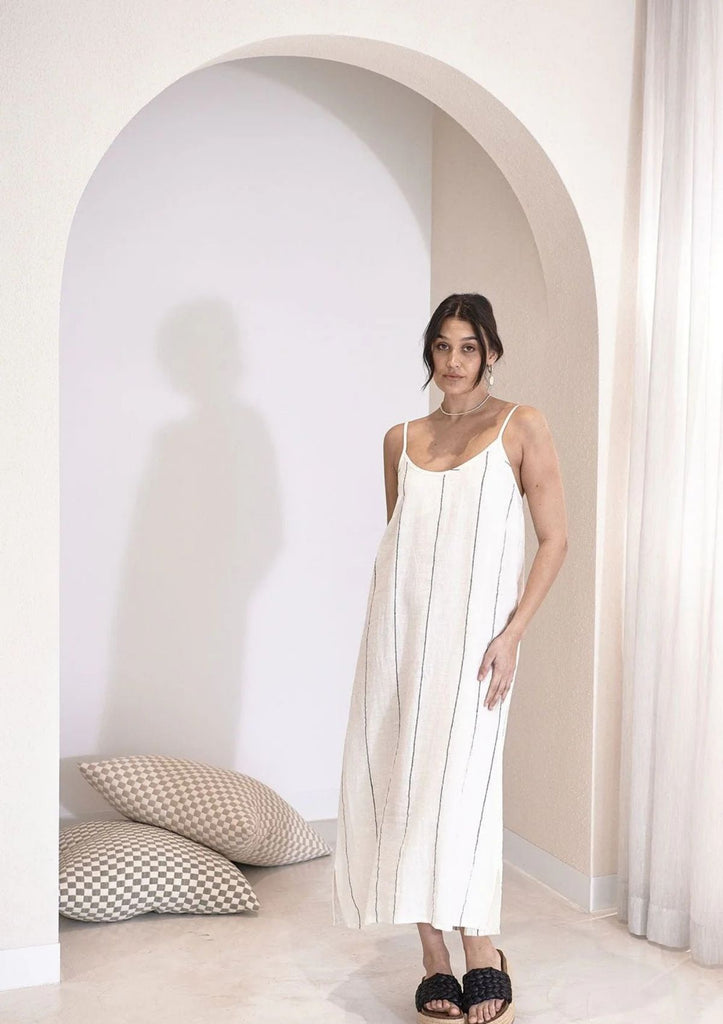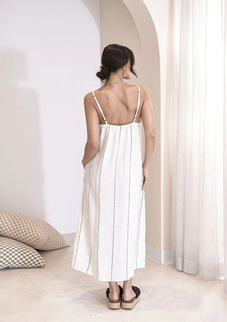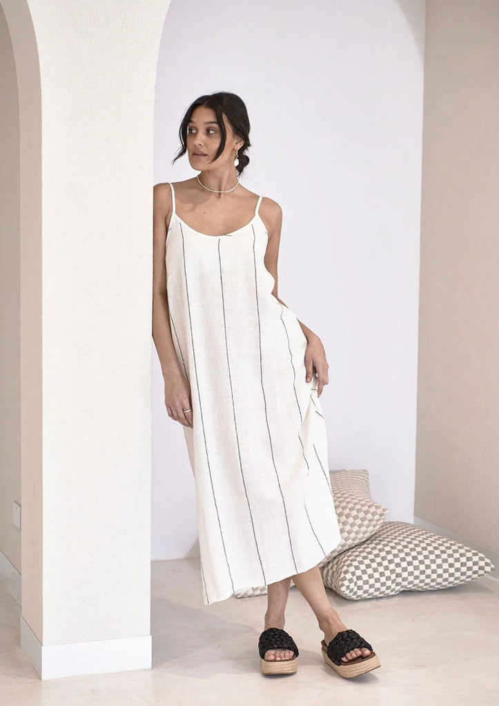 Eadie Carter Fundamental Linen Midi - Off White w Charcoal Fine Stripe