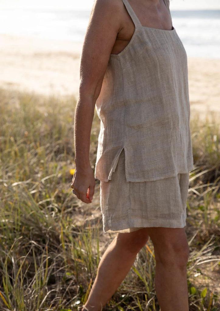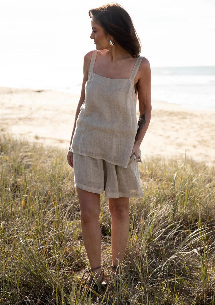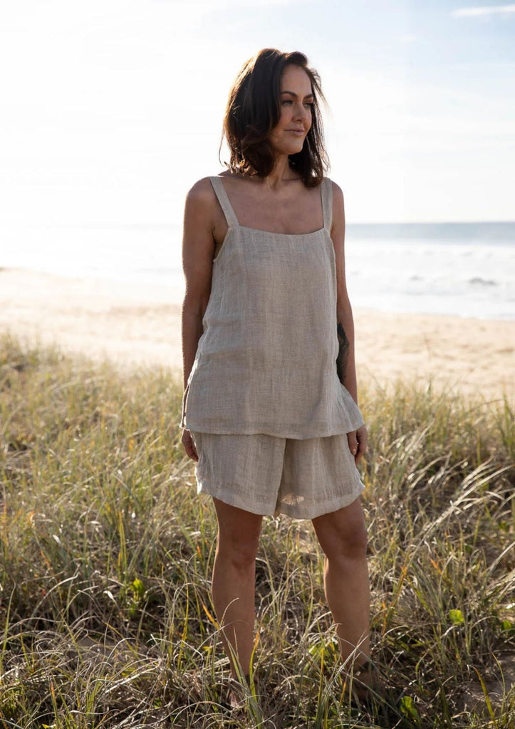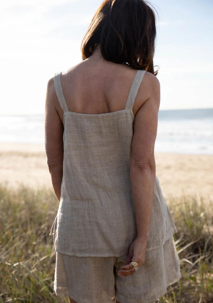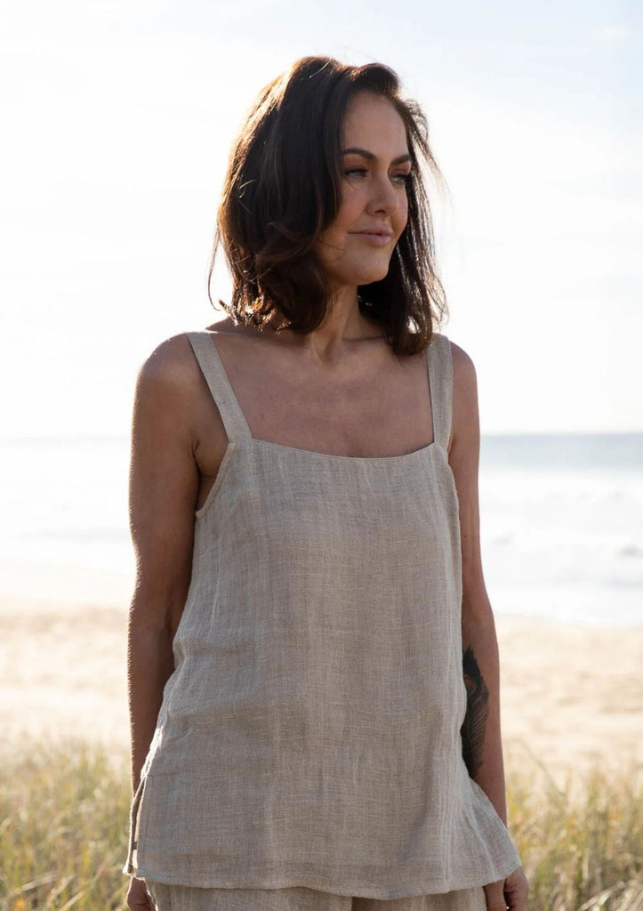 The design of the Classic Linen Tank is refined and classic. The neckline is a square cut and shows off the perfect amount of décolletage. The bottom hem falls just above the hip, pairing elegantly with the Arana Pant or Tallows Shorts.