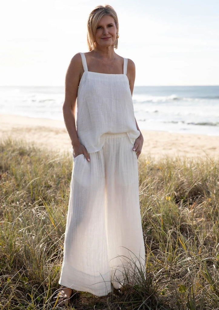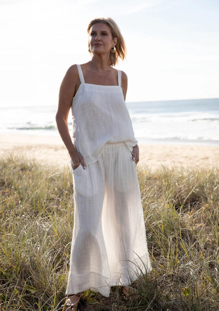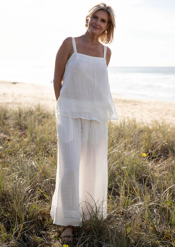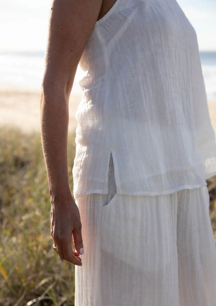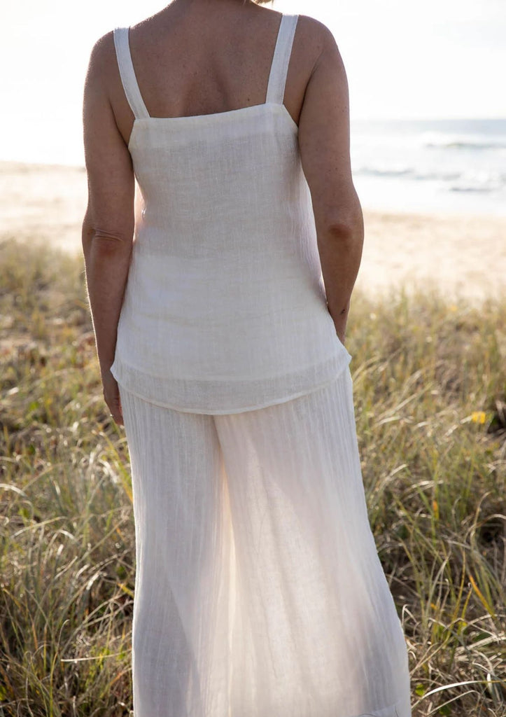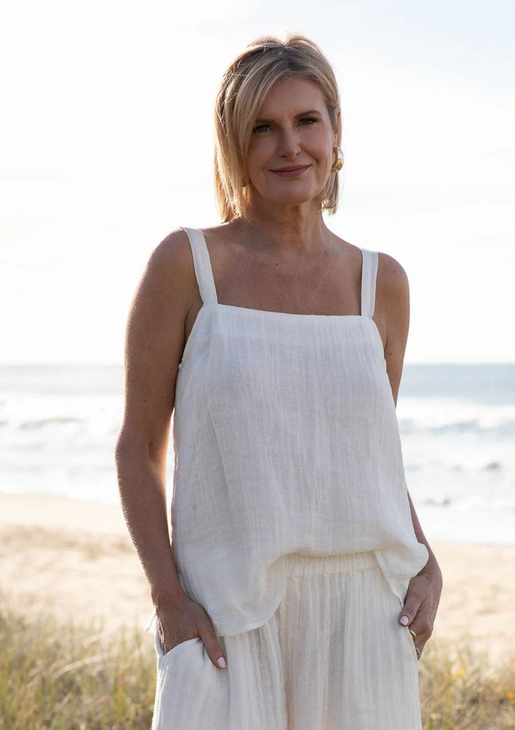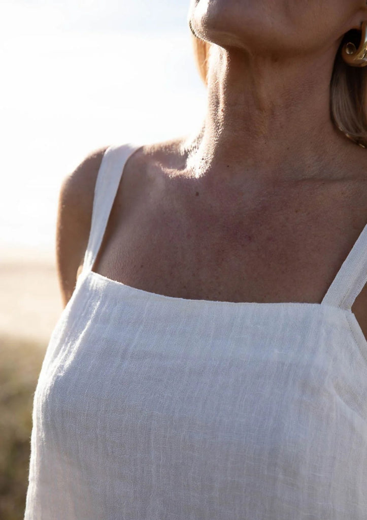 The design of the Classic Linen Tank is refined and classic. The neckline is a square cut and shows off the perfect amount of décolletage. The bottom hem falls just above the hip, pairing elegantly with the Arana Pant or Tallows Shorts.