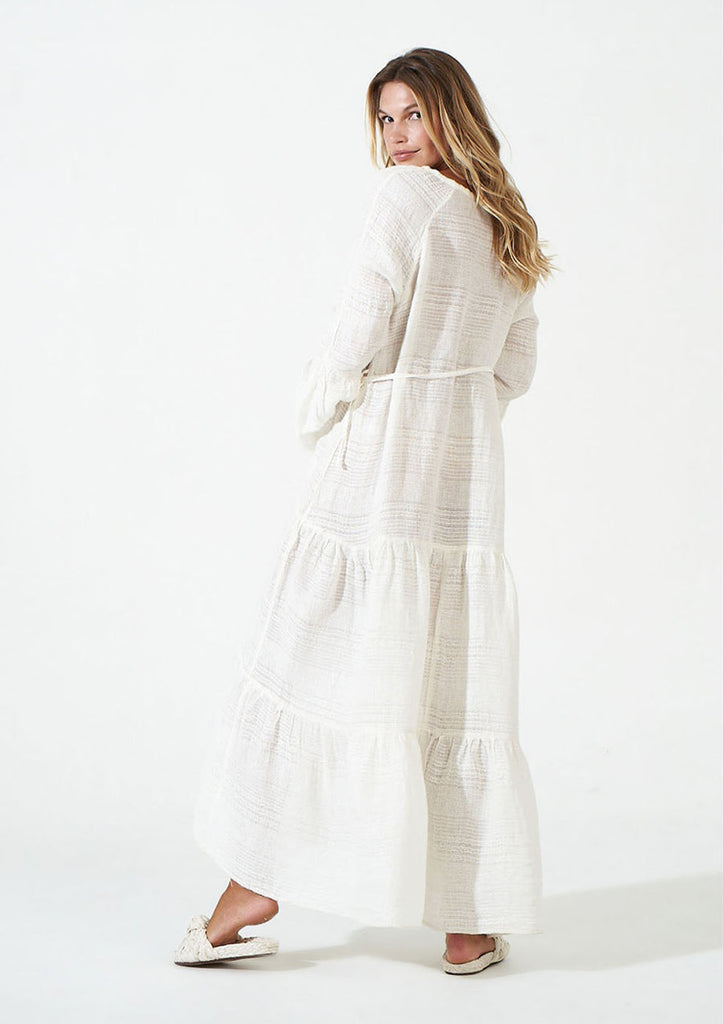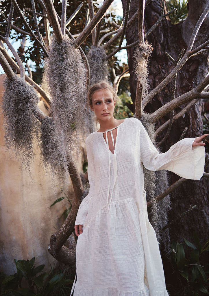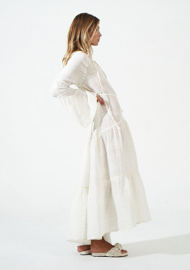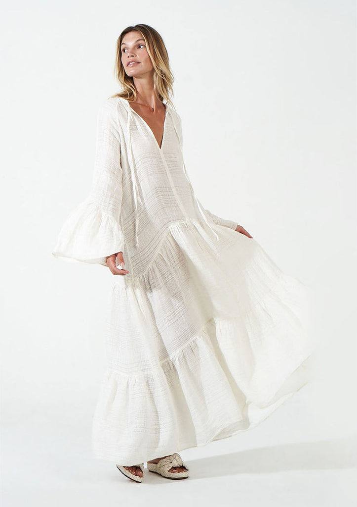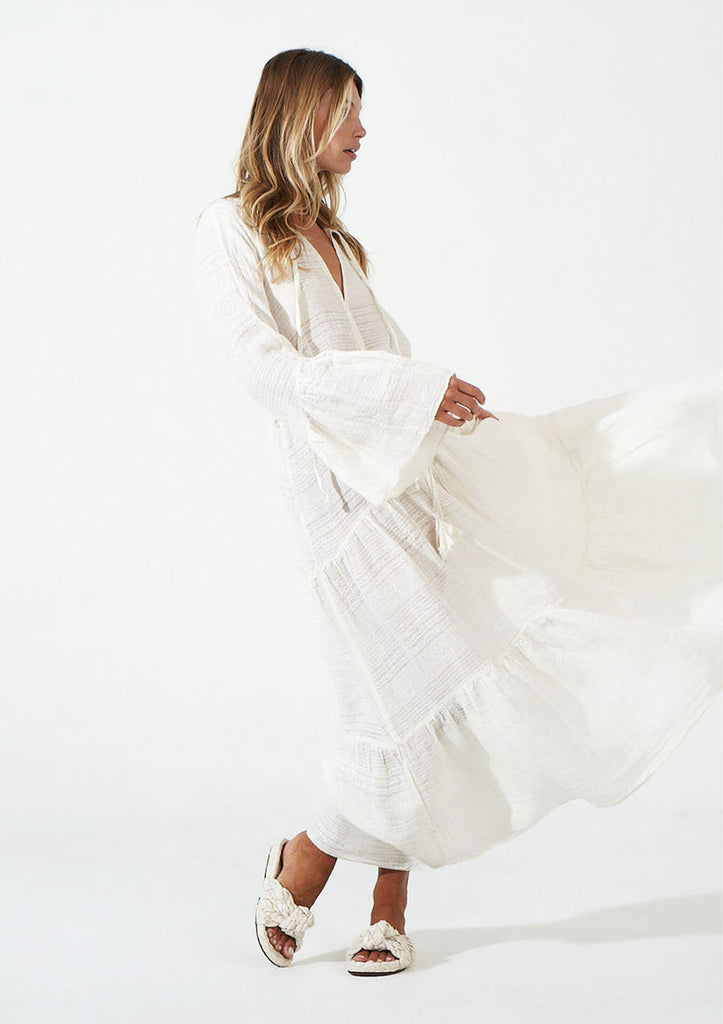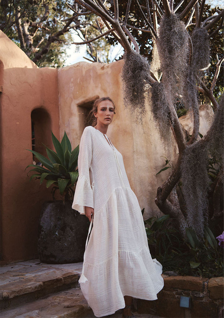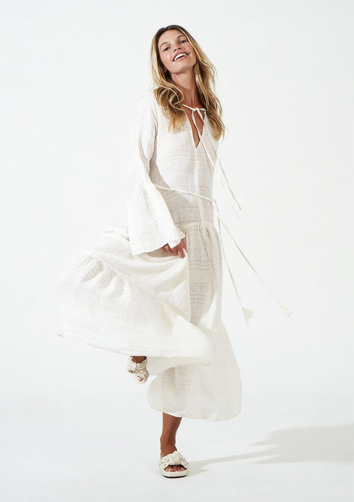 The Maxi Viva Dress is a floor length dress that features a v-neckline with a tie for closure. The relaxed shoulders drop to a full length flared sleeve for a 70’s boho luxe feel. The dropped hem and two-tiered hem makes way for the ultimate floaty silhouette to swan around in this Summer.