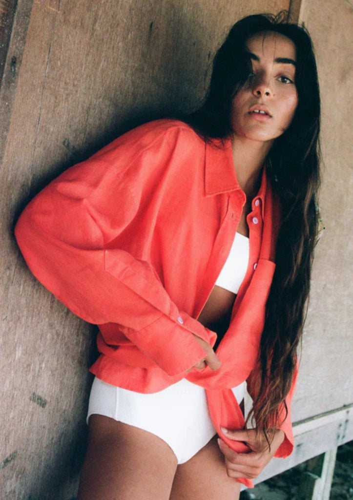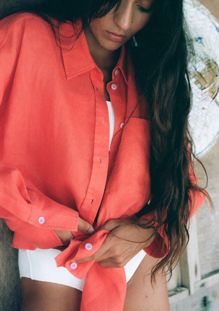 Our signature shirt KIRRA is an all year round wardrobe staple. This oversized shirt features a hi-low curved hem for a flattering fit, and natural buttons made from Corozo, Coconut, or Shell. Dress it up or down with the Lilly Pilly OLI linen pants, layer under a cashmere knit or throw it on as a beach cover up.