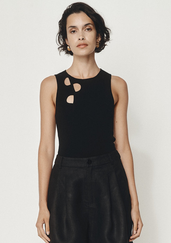 The Renzo Singlet from Marle features a high round neckline, wide singlet straps and a fitted silhouette that is finished with a tonal seam detail down the front with 3 cut outs. This singlet is finely knitted in a signature cotton and merino yarn.