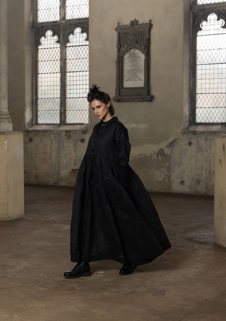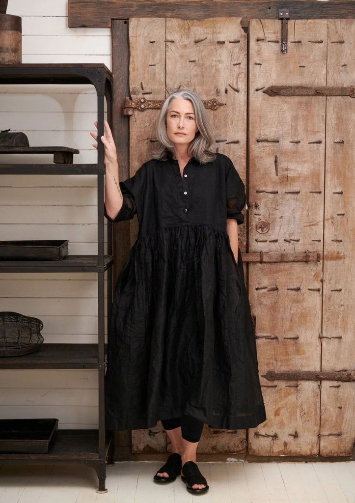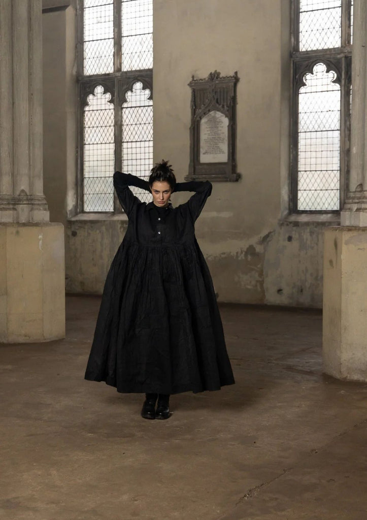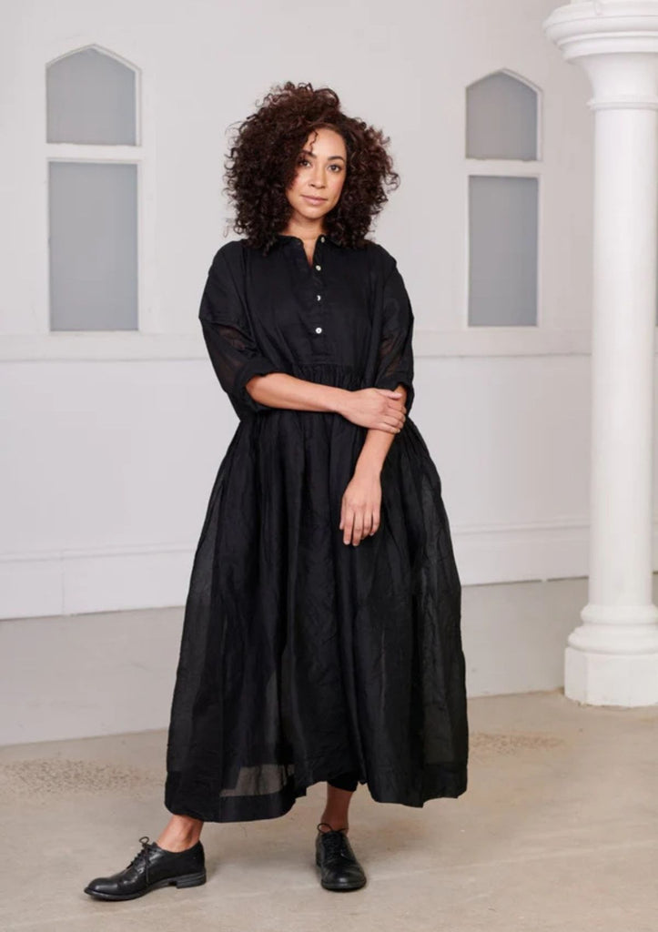 Our Edith Dress is made from a stiff and textured cotton organdy material and features a classic collar and our agoya shell buttons on the bodice. The waist is gathered to create a dramatic look. The dress is sheer, so we recommend layering with a slip or tights and cami. There are side pockets.