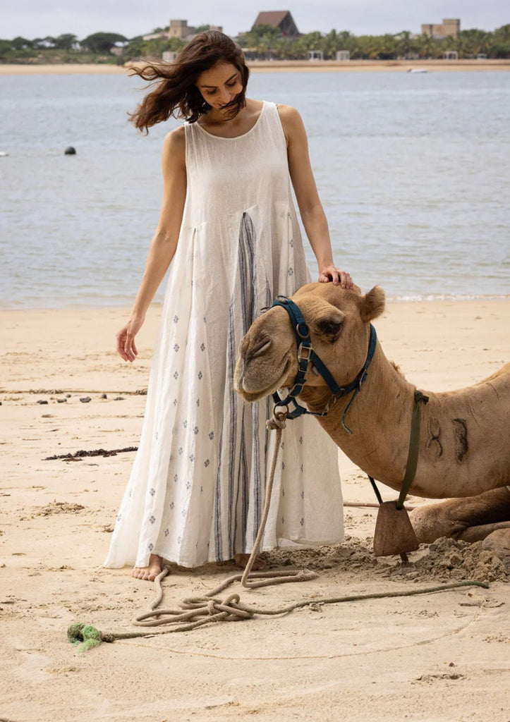 The Inaya Dress is made from 100% linen and designed for everyday comfort. It features a sleeveless, A-line silhouette with inverted pleats at the front and back. Inside each pleat is a different linen print that subtly reveals itself as you move.