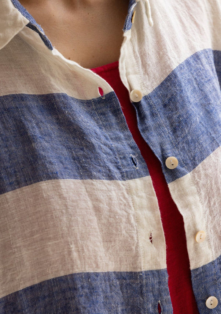 Crafted from a medium-weight linen, the Meg By Design Moyo Shirt features a classic collar and their signature agoya shell buttons. Its oversized, boxy cut gives it a timeless and relaxed feel. You can wear it buttoned up as a shirt or open as a lightweight jacket.