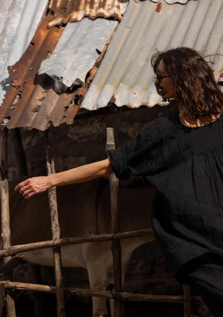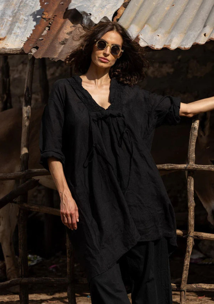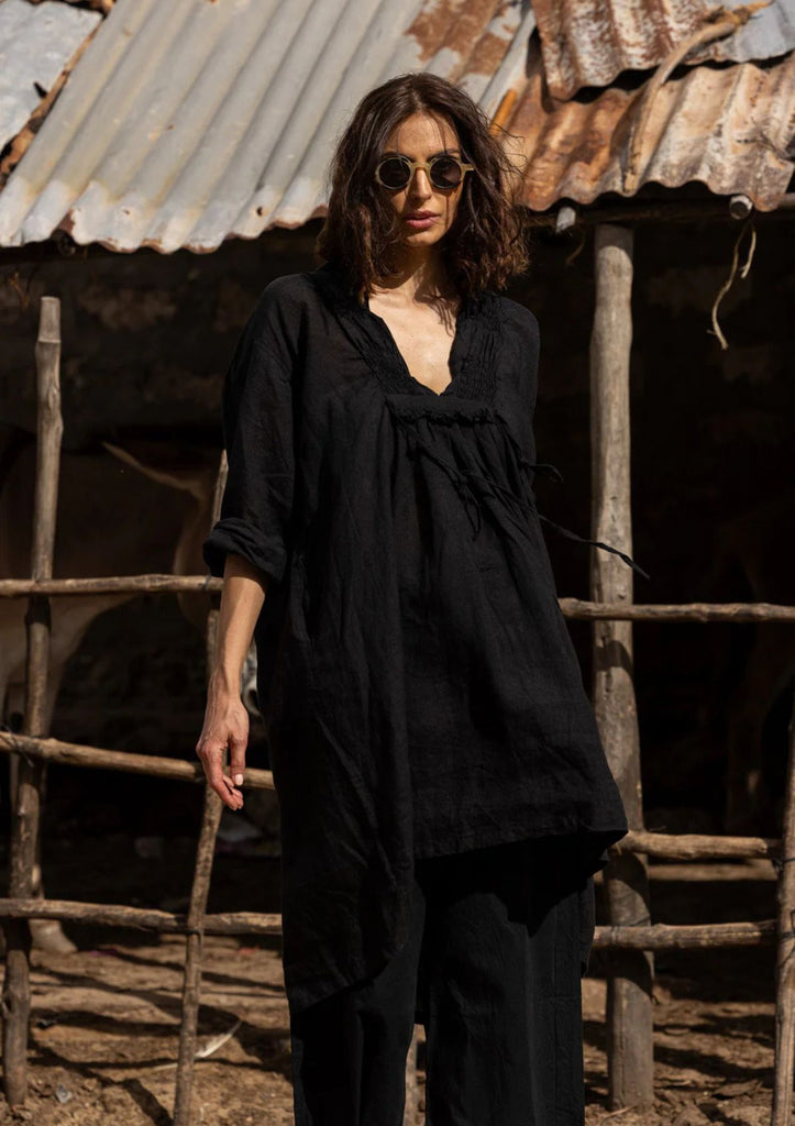 The Nzuri Tunic is a reinvented version of one of Meg By Design's earlier pieces. Made from medium-weight linen, it features a detailed bodice with soft ruching and decorative ties. Designed to be worn long, it pairs effortlessly with pants or leggings for a relaxed, casual look.
