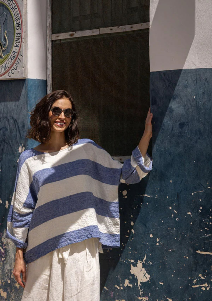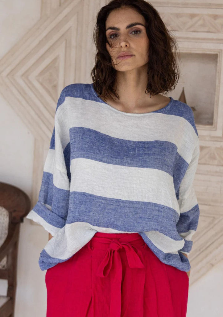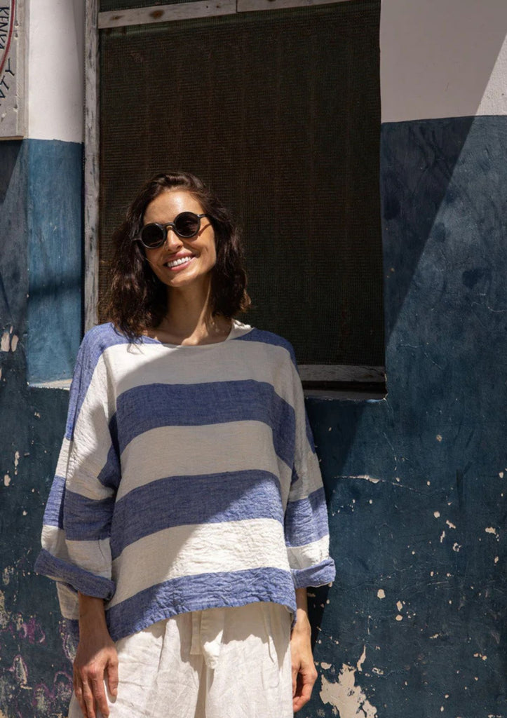 The Meg By Design Saba Top is made from breathable, medium weight linen and features bold horizontal stripes in soft natural tones. Its boxy, relaxed cut is designed for comfort and ease, while the wide neckline and dropped shoulders create a flattering, effortless silhouette. The sleeves can be rolled for a more casual and flattering look.