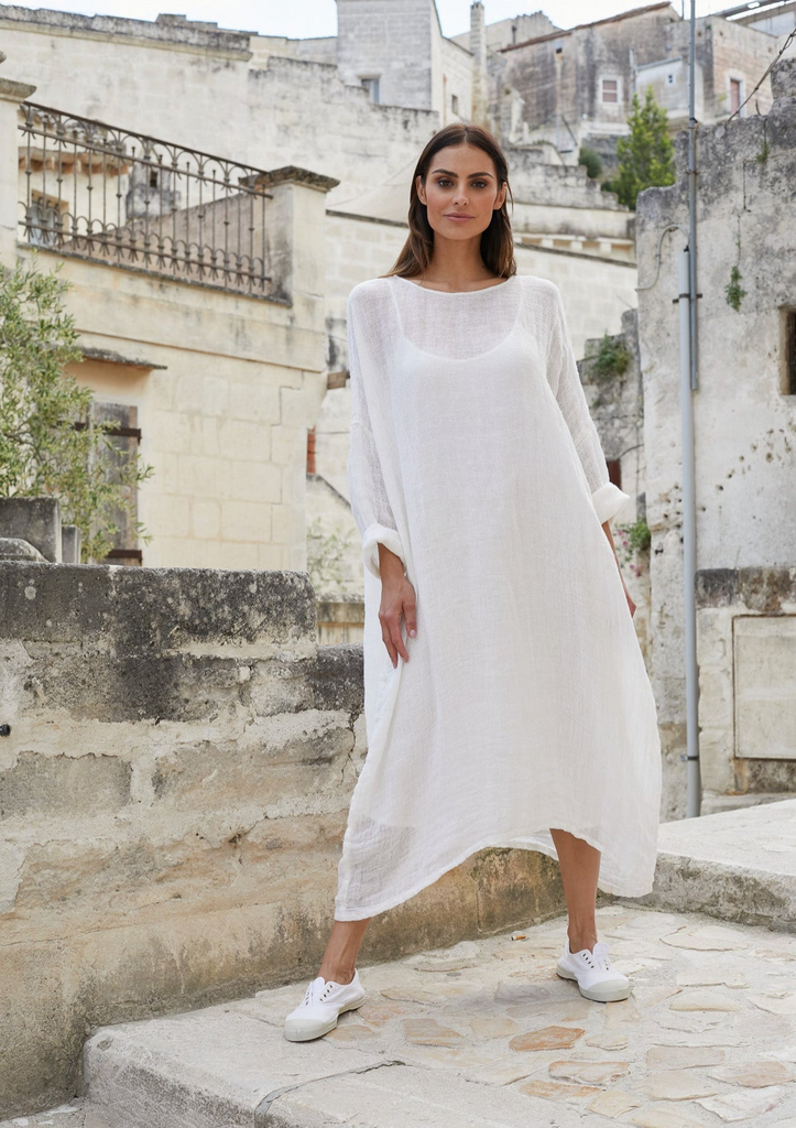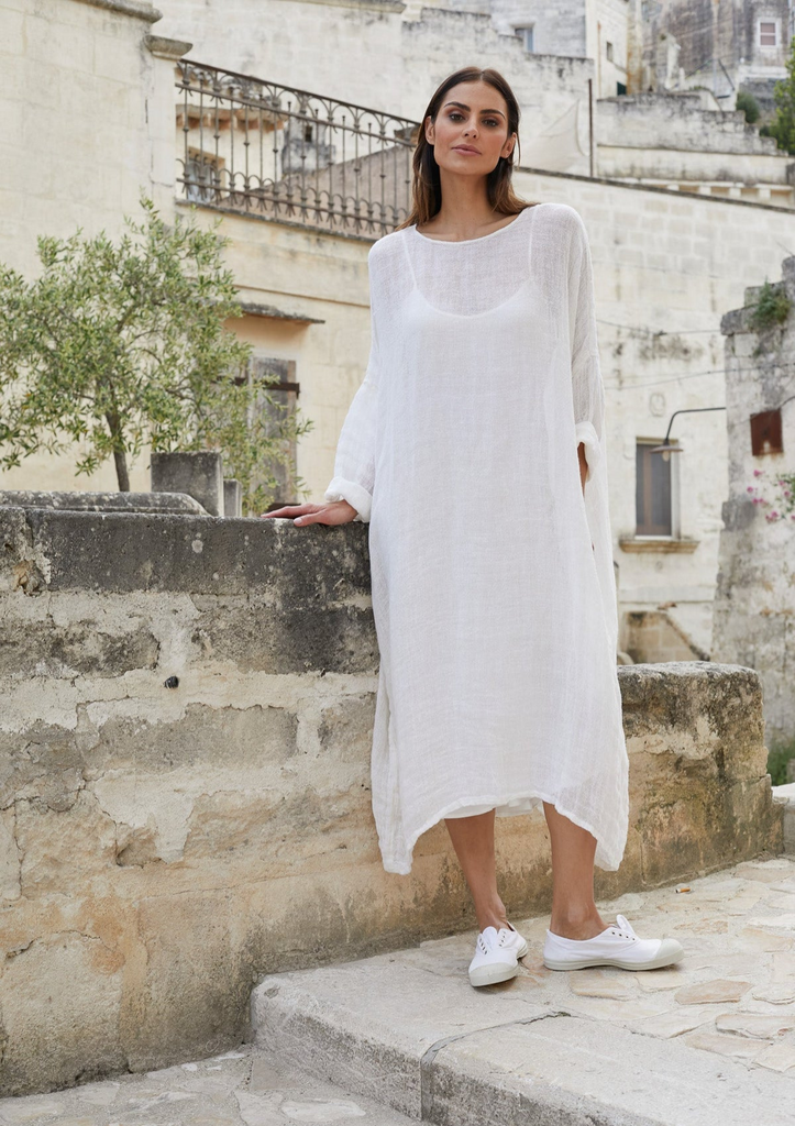 Our St Barts Dress is back and made from a beautifully open weave medium weight linen gauze.