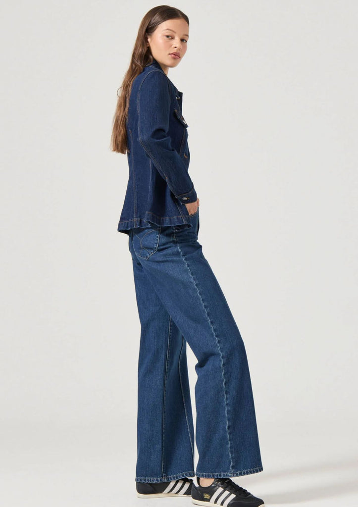 This is a super high-rise, wide leg jean, made with a non stretch denim. Fits true to size.