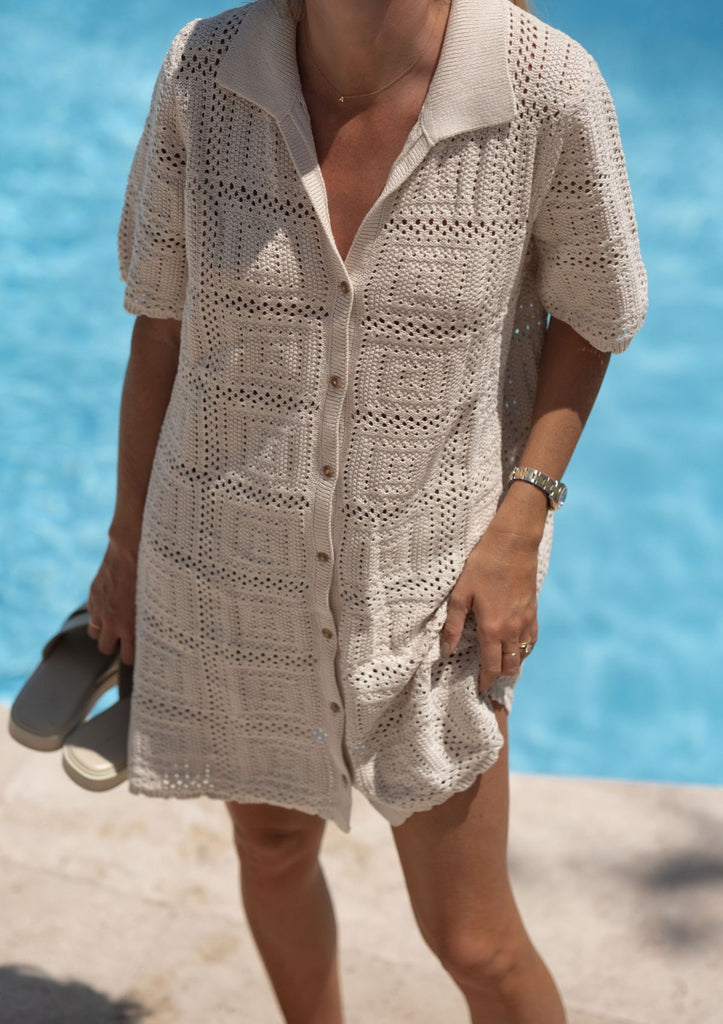 The Square Knit Mini Dress is crafted in 100% organic cotton, effortlessly delivering the perfect touch of nostalgia. This garment is unlined but is detailed with an intricate square knit design. Above-the-knee length with a scalloped hemline, classic collar and functional button up front, this dress combines timeless design with a modern twist.