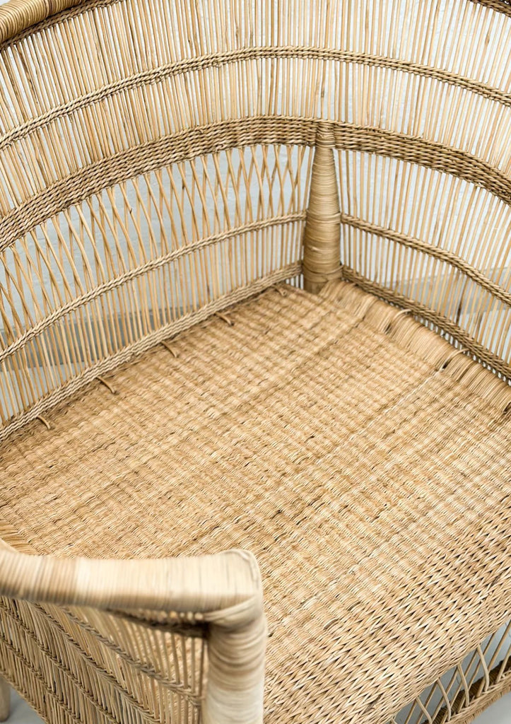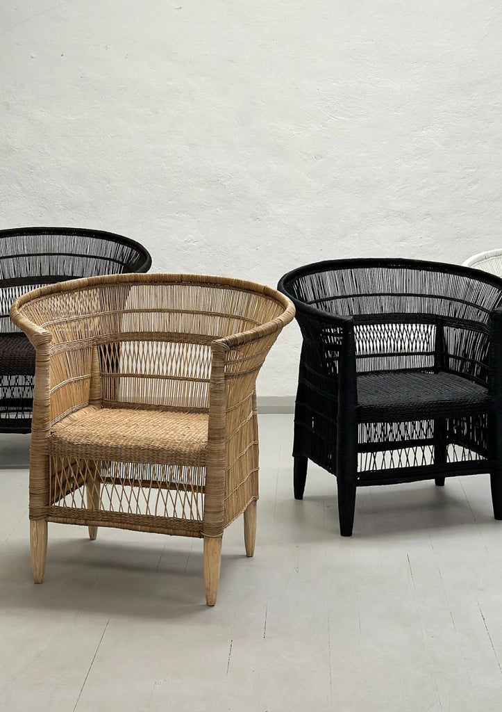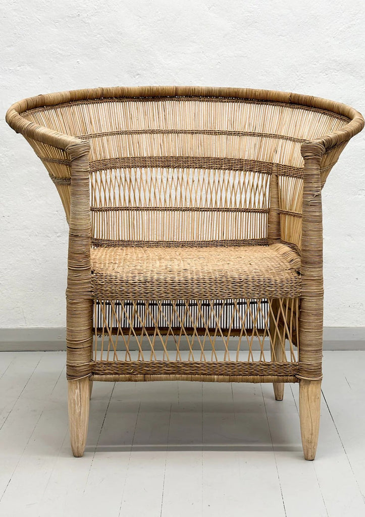 A sculptural and textural piece, the Malawi cane chair is handwoven from natural cane over a sturdy timber frame. Its flared arms and open-weave design bring a relaxed, artisanal feel to any setting.