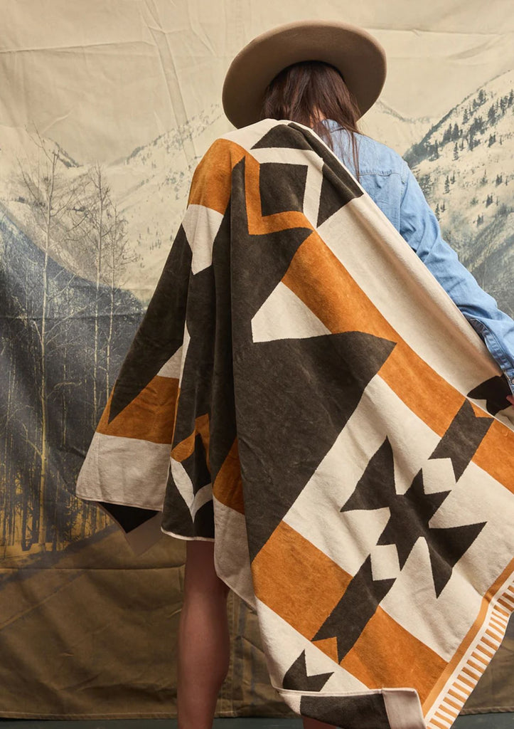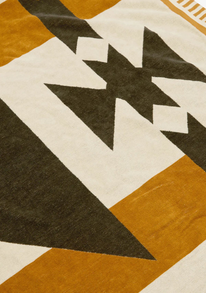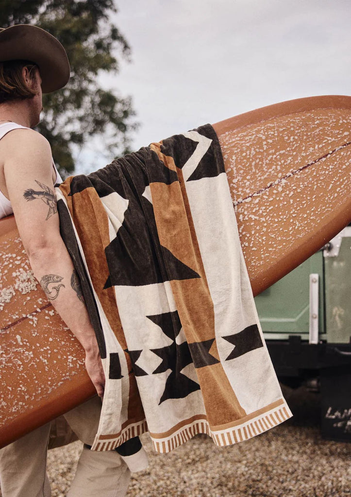 Woven in a rich palette of earthy khaki, warm cream, and bold brown/spice, this towel captures the contrasts of the mountain range - from snow-dusted peaks to sunlit trails and ancient stone. The design flows with organic, angular patterns - a nod to jagged ridgelines and wild alpine contours.