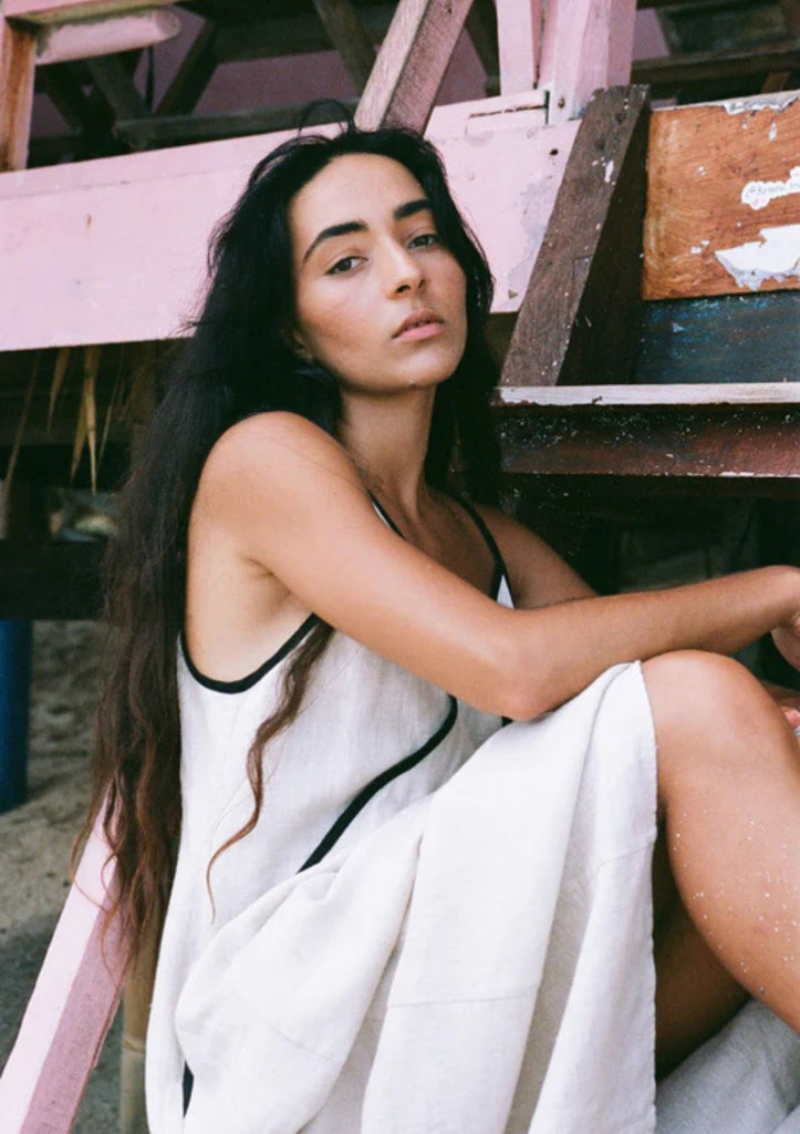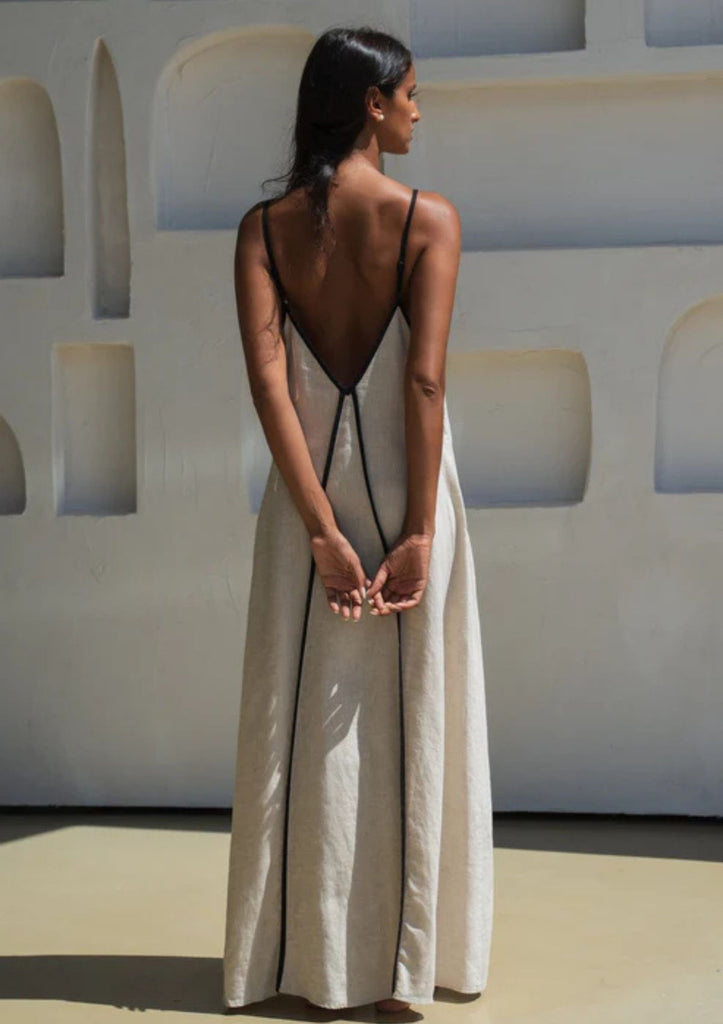 AZALEA - your new go-to flowy maxi linen dress made from 100% EUROPEAN FLAX® certified linen. Featuring a relaxed fit & flattering V neckline, she’s effortlessly chic and comfy all day long. The contrast binding adds a subtle detail, while adjustable shoulder straps make sure the fit is just right. Plus pockets on the front contrast bind. Petite and curvy-bust friendly.