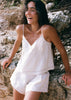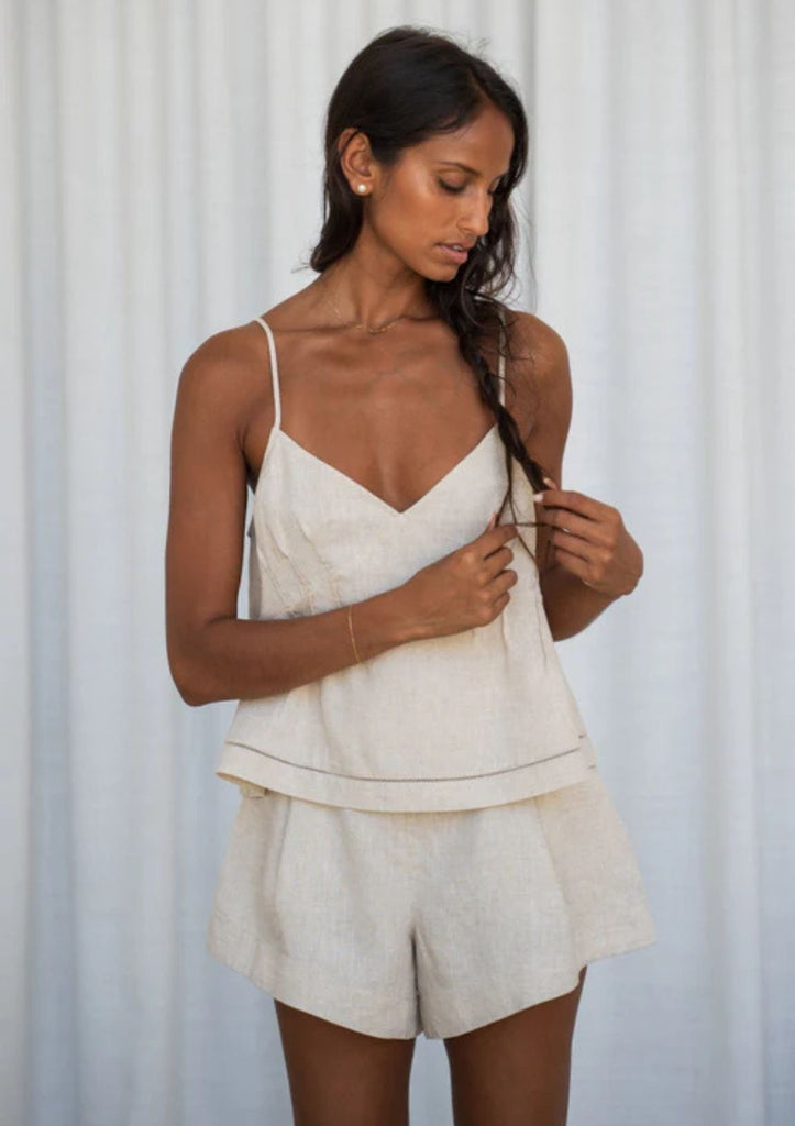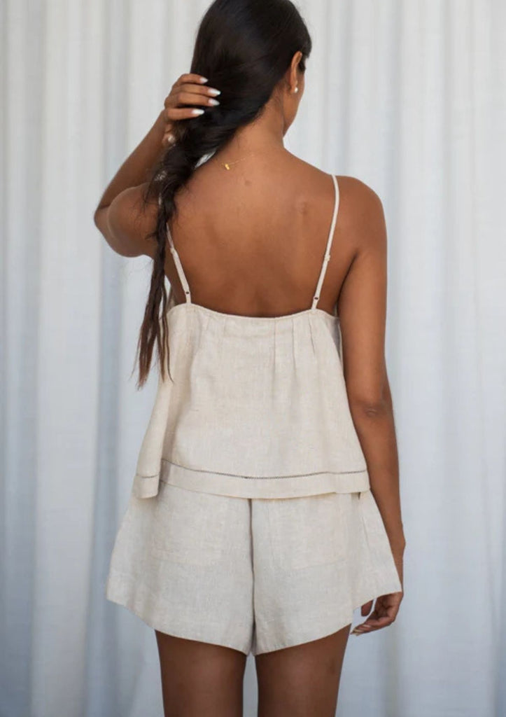 GAIA Linen Shorts. These A-line shorts feature a side invisible zipper, side pockets, Elastic back waist band and slightly angled hem for a flattering fit. Pair with the ROSA cami or TINA top or matching PIXIE shirt for an effortless summer ensemble.
