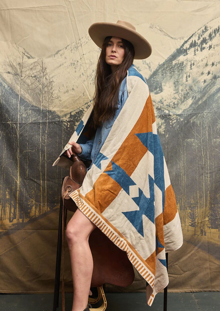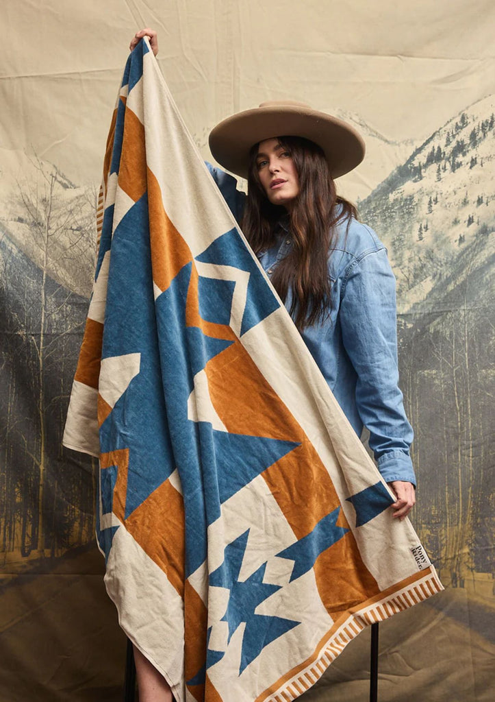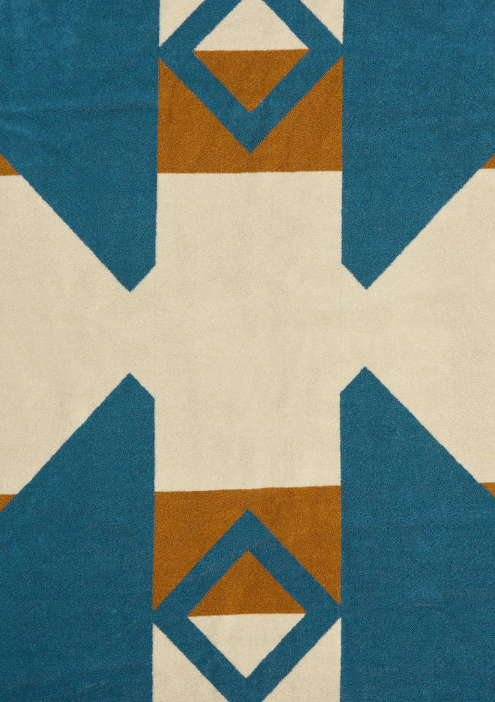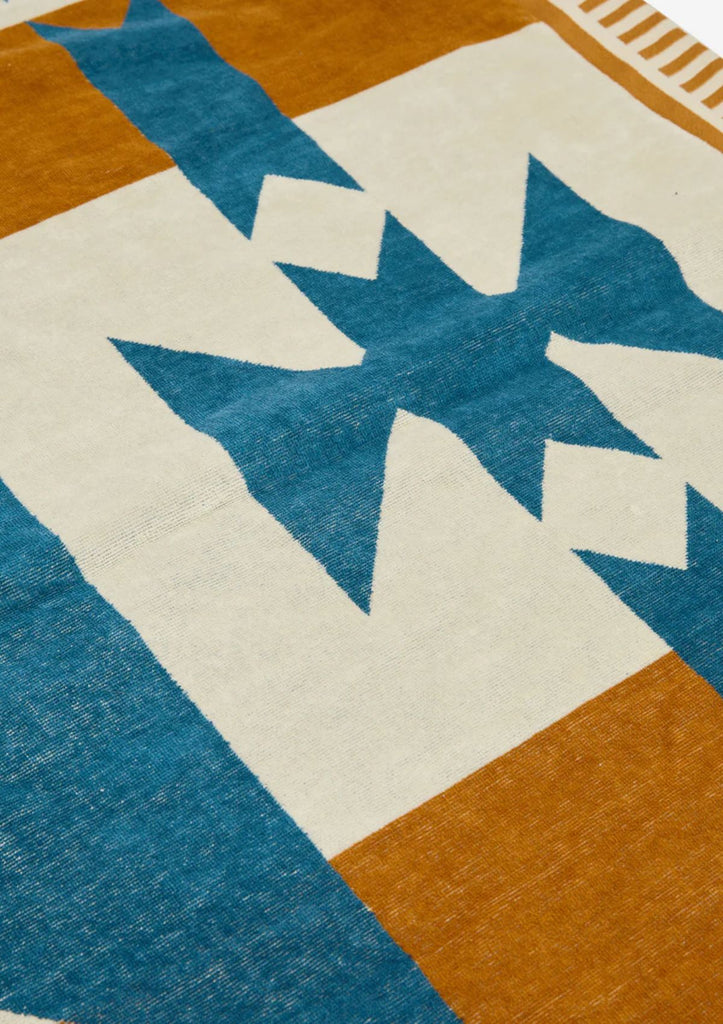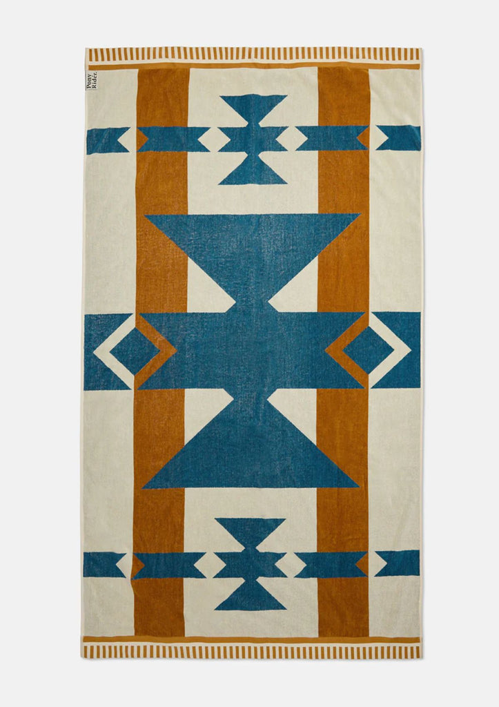 Crafted in a striking blend of deep blue, warm cream, and earthy spice tones, this towel captures the essence of sunbaked canyons, endless skies, and quiet desert sands. The design walks the line between geometric structure and organic movement, echoing the contours of nature’s finest terrain.