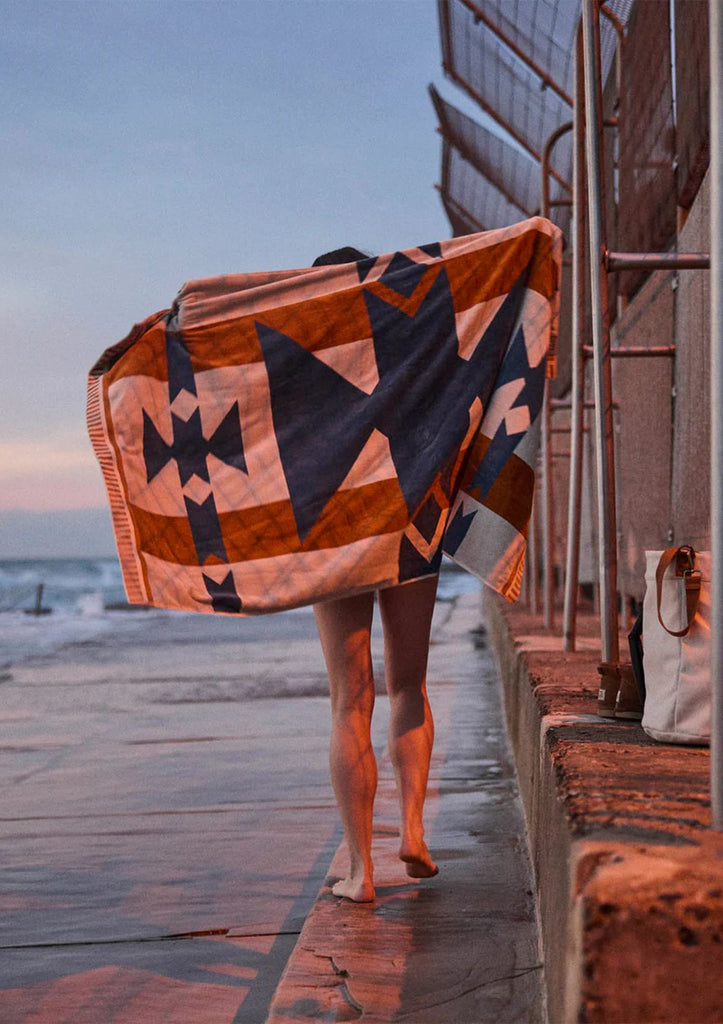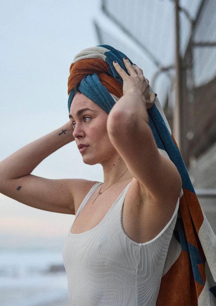 Made from Terry Cut Pile, one side features an absorbent loop for drying off fast, while the other side is luxuriously velour - plush, soft, and oh-so-sink-into-able. This is beachwear, reimagined for the wild-hearted and design-minded and if you're one to always be on On the go - Roll, don’t fold, to stay travel-ready.