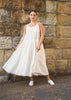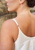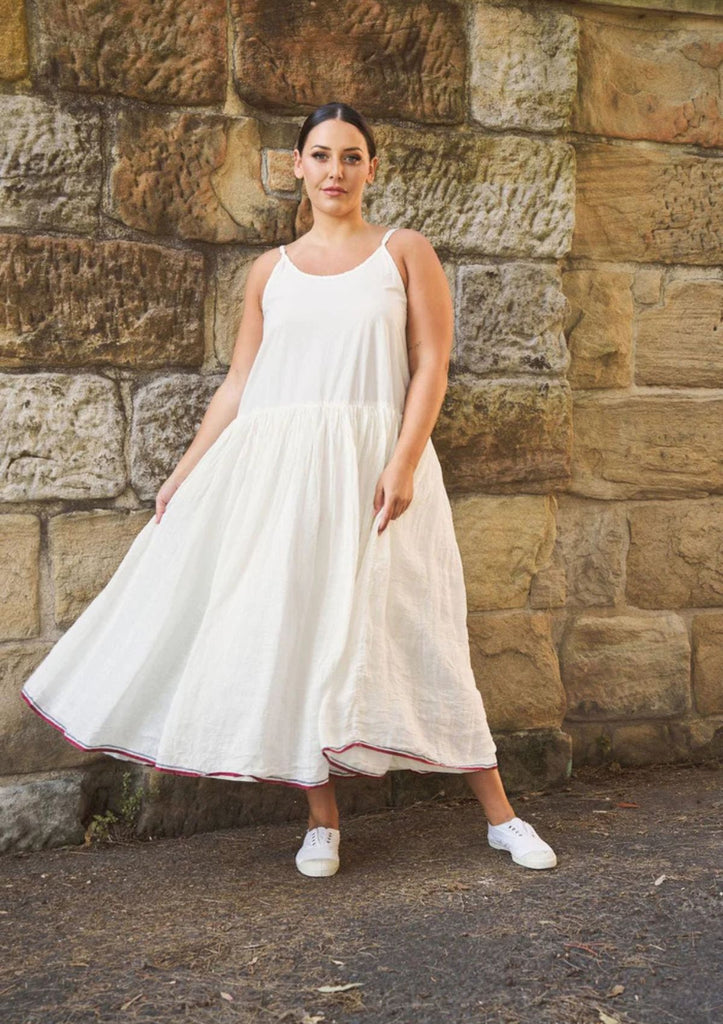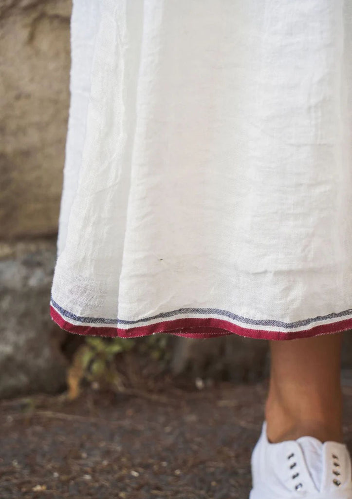 This High Tea slip is made from a buttery paper cotton slip with a gauze linen overskirt. The fine delicate blue and white stripe at the bottom add such a beautiful touch of colour to every outfit.