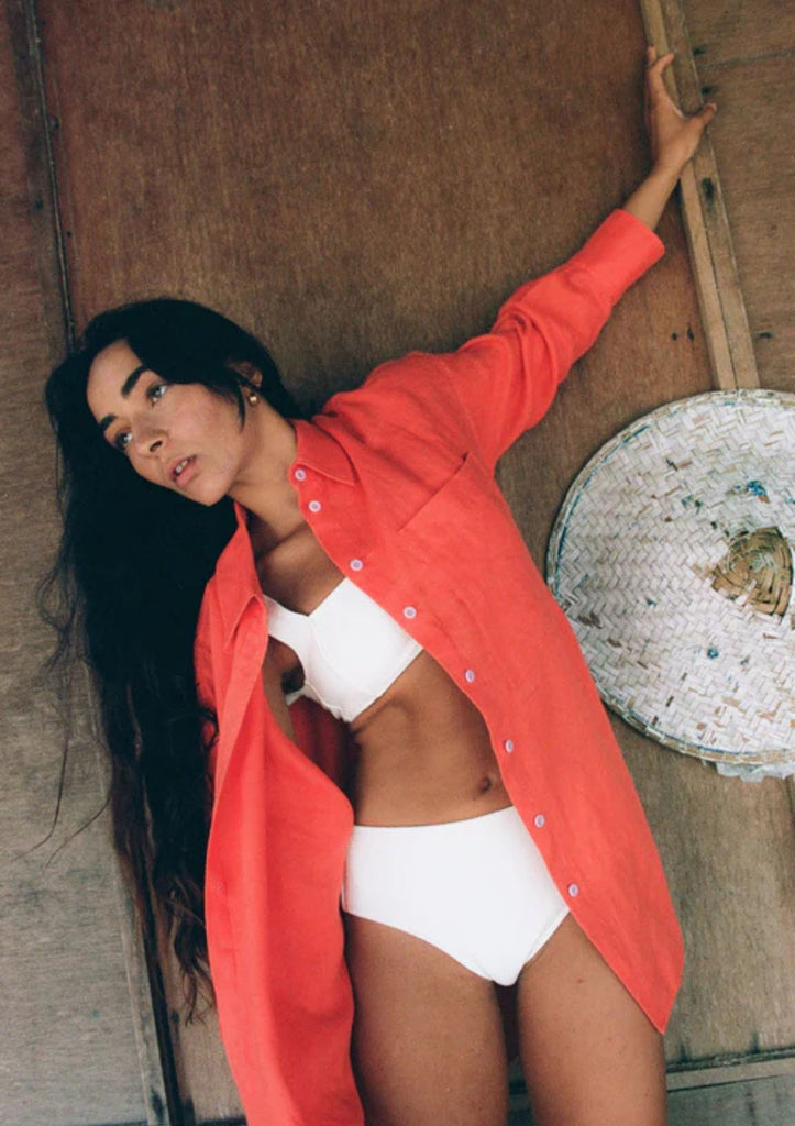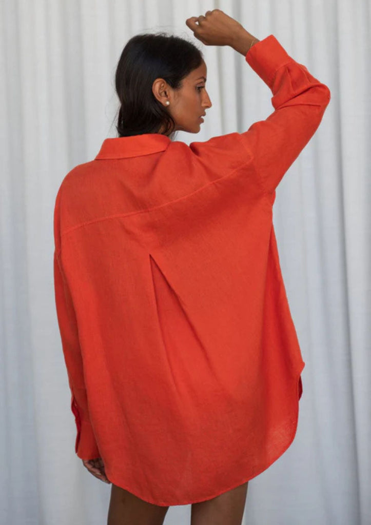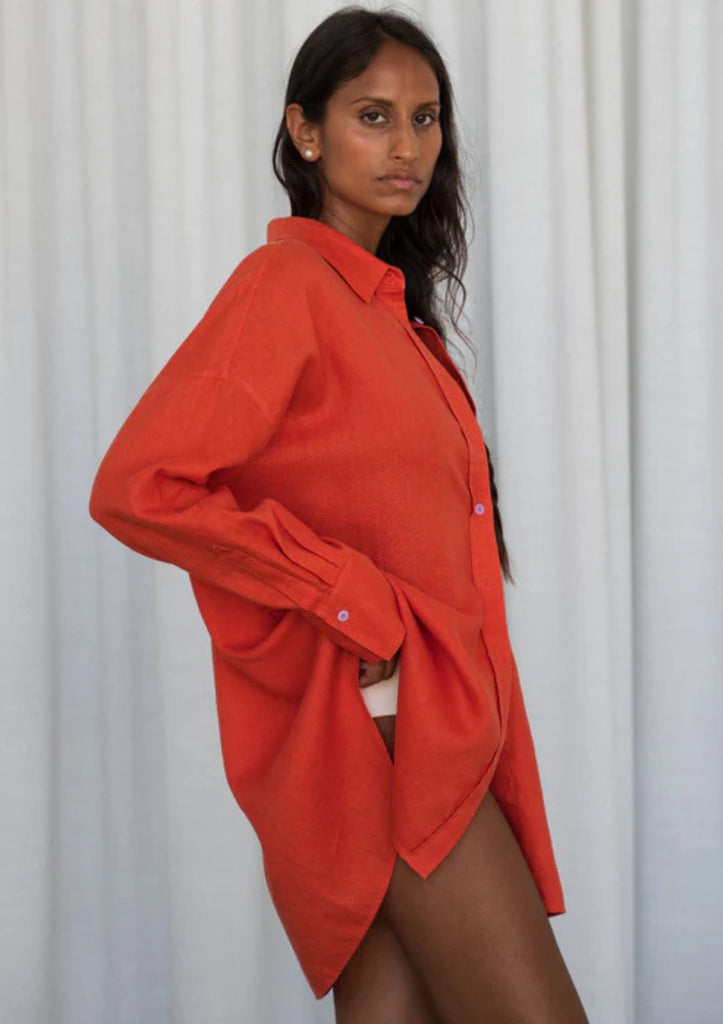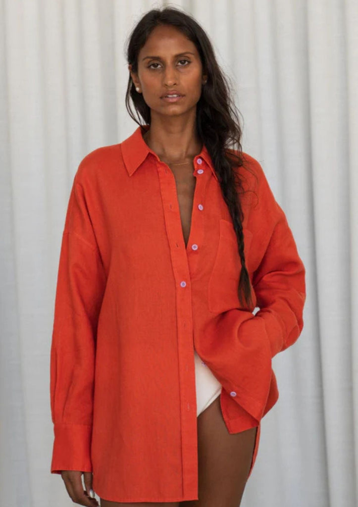 Our signature shirt KIRRA is an all year round wardrobe staple. This oversized shirt features a hi-low curved hem for a flattering fit, and natural buttons made from Corozo, Coconut, or Shell. Dress it up or down with the Lilly Pilly OLI linen pants, layer under a cashmere knit or throw it on as a beach cover up.