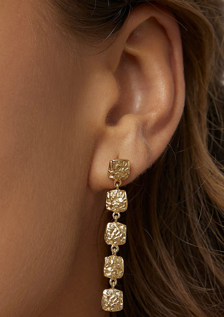 - Glamour takes a whole new meaning with our extravagant Emilia Earrings! With a long crushed gold drop, these earrings are a serious statement that will turn heads!