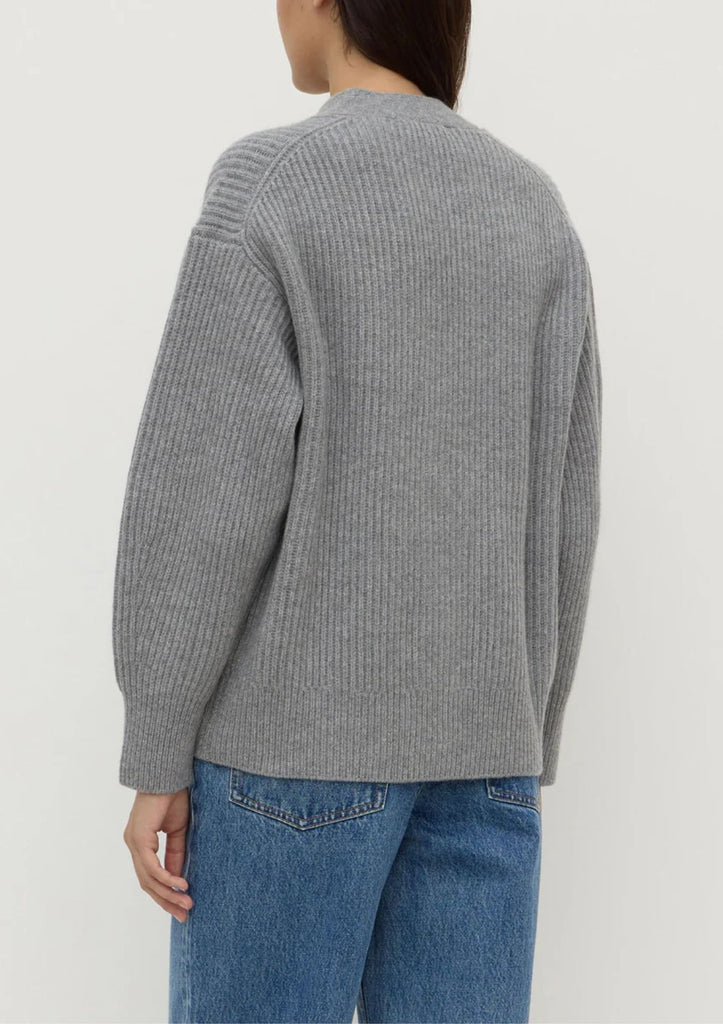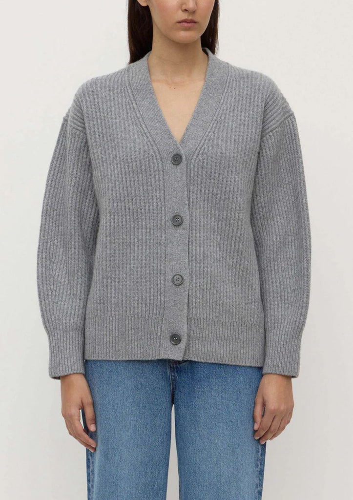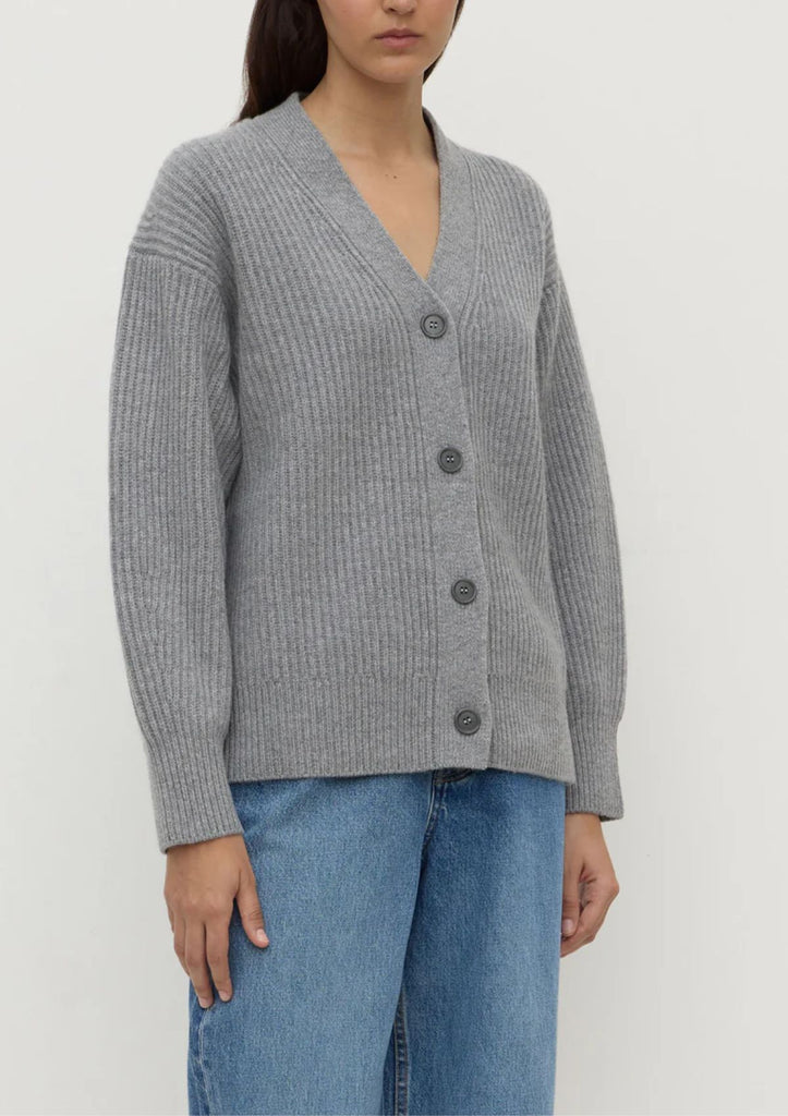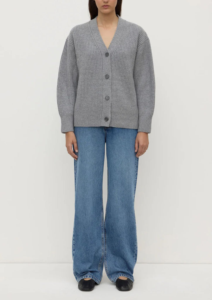The Paloma Knit Cardigan in grey marle is a wool cashmere blend cardigan with a relaxed fit and dropped shoulders.
