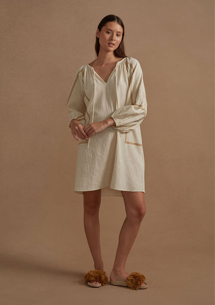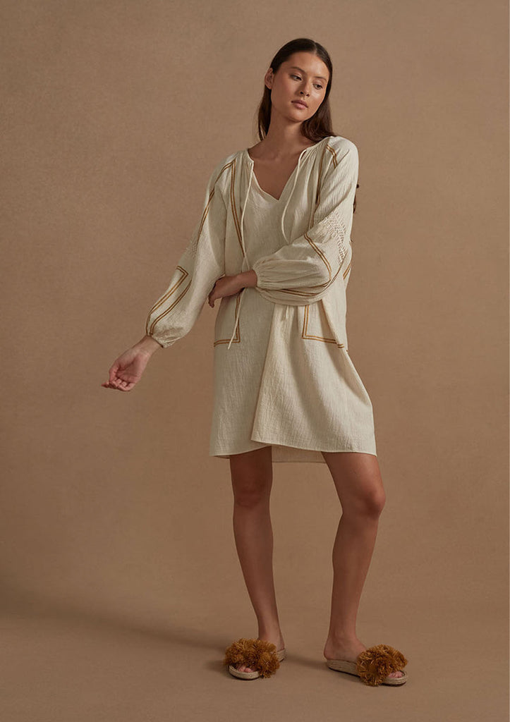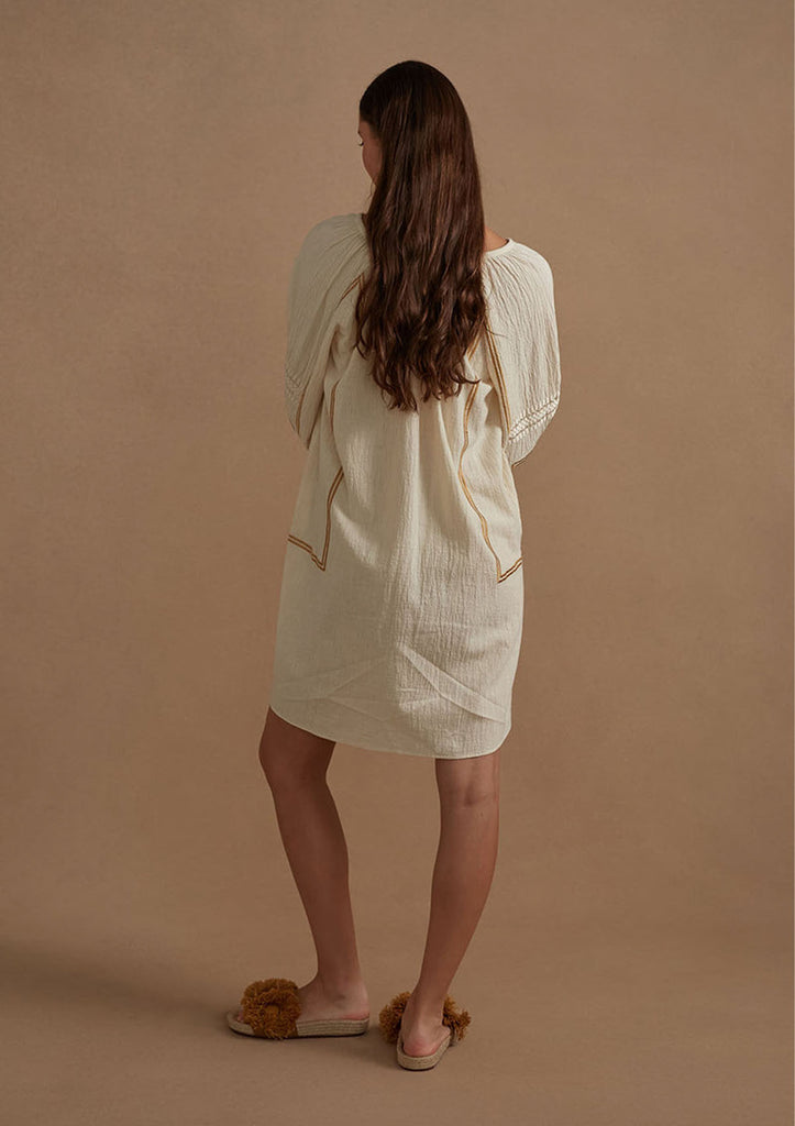 Introducing the Mista Dress – a charming embodiment of summer style. Crafted from lightweight cotton-gauze, this dress boasts intricate contrast embroidery that adds a point of difference.